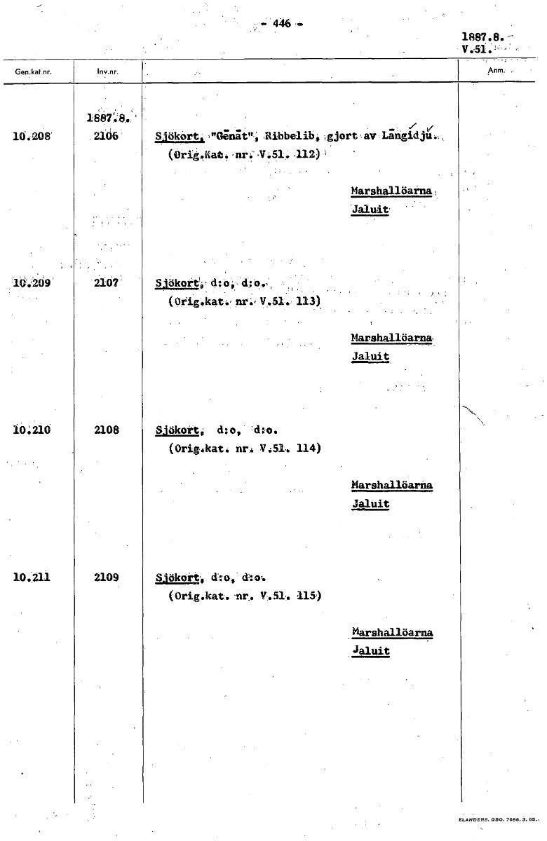 • 446 1887.8. Anm.. 1687:8.' 10.208' 210 Sjökort, ,fteklit", ,Ribbelib, g ortlavLangid (Orig.Kat. nr. V.51.•112) Marshallöarna `Jaluit• 10.:24:19' 2107 Siökorti, 4: ö; cl: (Orig.kat.• nr., V.51.. 113) M... Visa hela