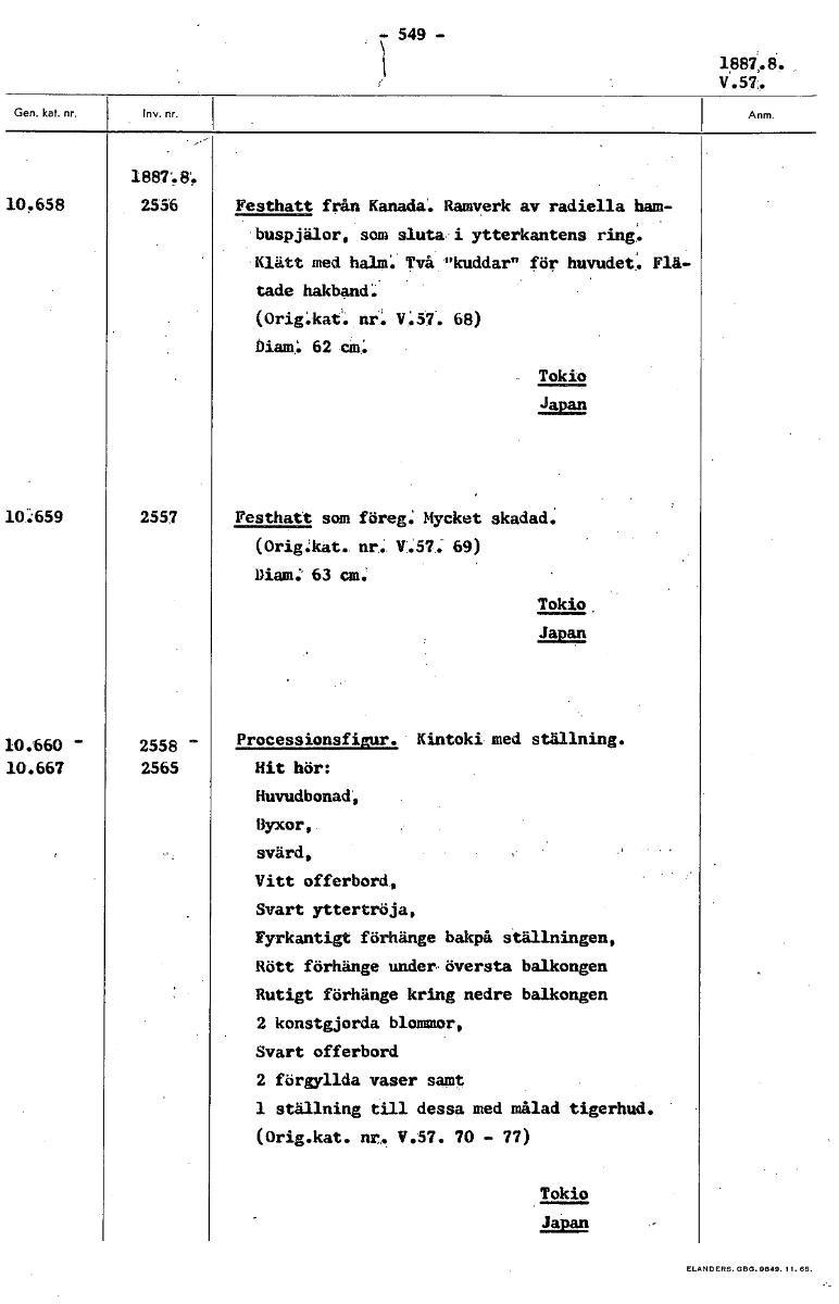 549 - 1887.8. V.57.. 1887:8'. 10.658 2556 Festhatt från Kanda. Ramverk av radiella bambuspjälor, som sluta i ytterkantens ring. Klätt med halm: Två "kuddar" för huvudet. Flätade hakband: (Orig.kat. nr. V:57. 68) Diam: 62 cm: Tokio Japan 10A59 2557 Festhatt som föreg: Mycket skadad. (Orig.kat. nr. V.57. 69) Diam: 63 cm. Tokio Japan 10:660 - 2558 - 2565 Processionsfigur. Kintoki med ställning. Hit hör: Huvudbonad, Byxor, svärd, Vitt offerbord, Svart yttertröja, Fyrkantigt förhänge bakpå ställningen, Rött förhänge under översta balkongen Rutigt förhänge kring nedre balkongen 2 konstgjorda blommor, Svart offerbord 2 förgyllda vaser samt 1 ställning till dessa med målad tigerhud. (Orig.kat. nr. V.57. 70 - 77) Tokio Japan [ocr]
