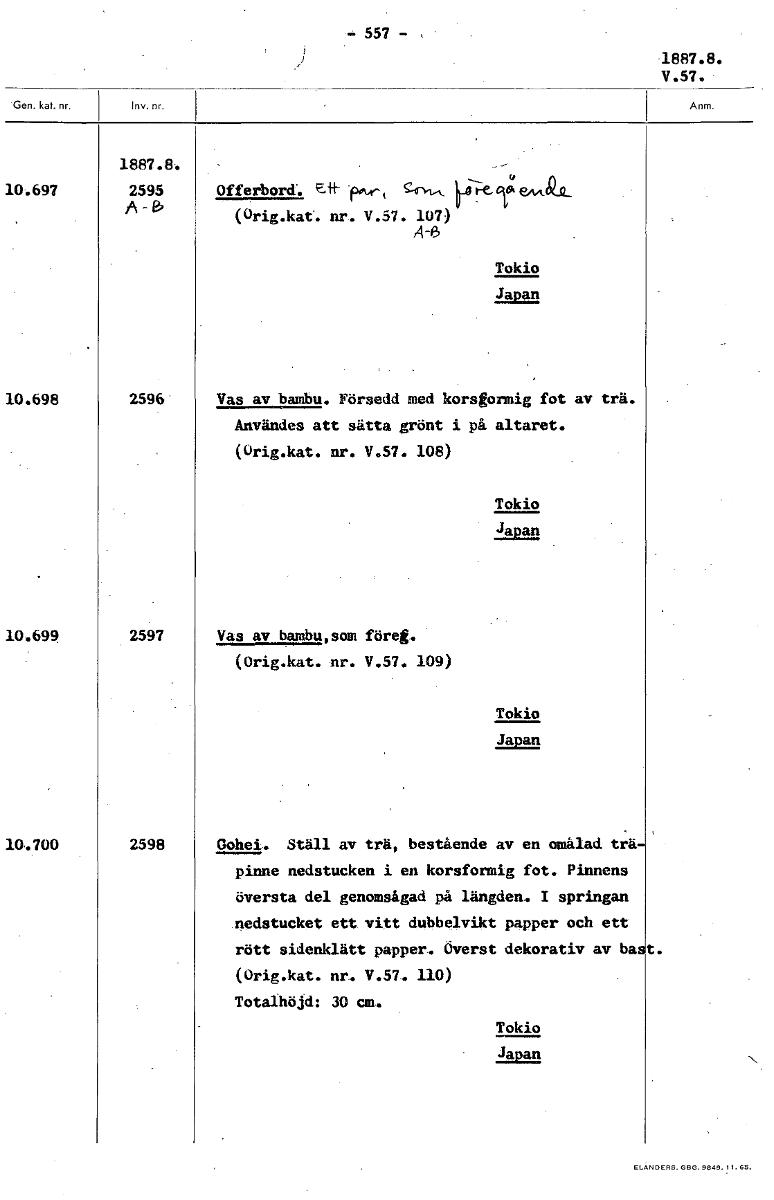 • -557- 1887.8. V.57. 1887.8. 104697 2595 Offerbord'. fmw-, Vkcy4,4,4),11_ A-6 (Orig.kat. nr. V.57. 107) Al5 Tokio Japan 10.698 2596 Vas av bambu. Försedd med korsgormig fot av trä. Användes att sätta g... Visa hela