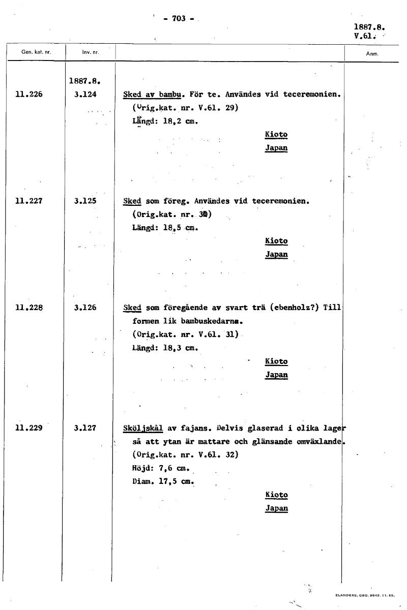' - 703 - 1887.8. 1887.8. 11.226 3.124 Sked av bambu. För te. Användes vid teceremonien. (urig.kat. nr. V.61. 29) Längd: 18,2 cm. Kioto Japan 11.227 3.125 Sked som föreg. Användes vid teceremonien. (Orig.kat. nr. 314) Längd: 18 5 cm. Kioto Japan 11.228 3.126 Sked som föregående av svart trä (ebenholz?) Till formen lik bambuskedarna. (Orig.kat. nr. V.61. 31) Längd: 18,3 cm. Kioto Japan 11.229 3.127 Sköljskål av fajans. Delvis glaserad i olika lage så att ytan är mattare och glänsande omväxlande (Orig.kat. nr. V.61. 32) Höjd: 7,6 cm. Diam. 17,5 cm. Kioto Japan [ocr]Stäng