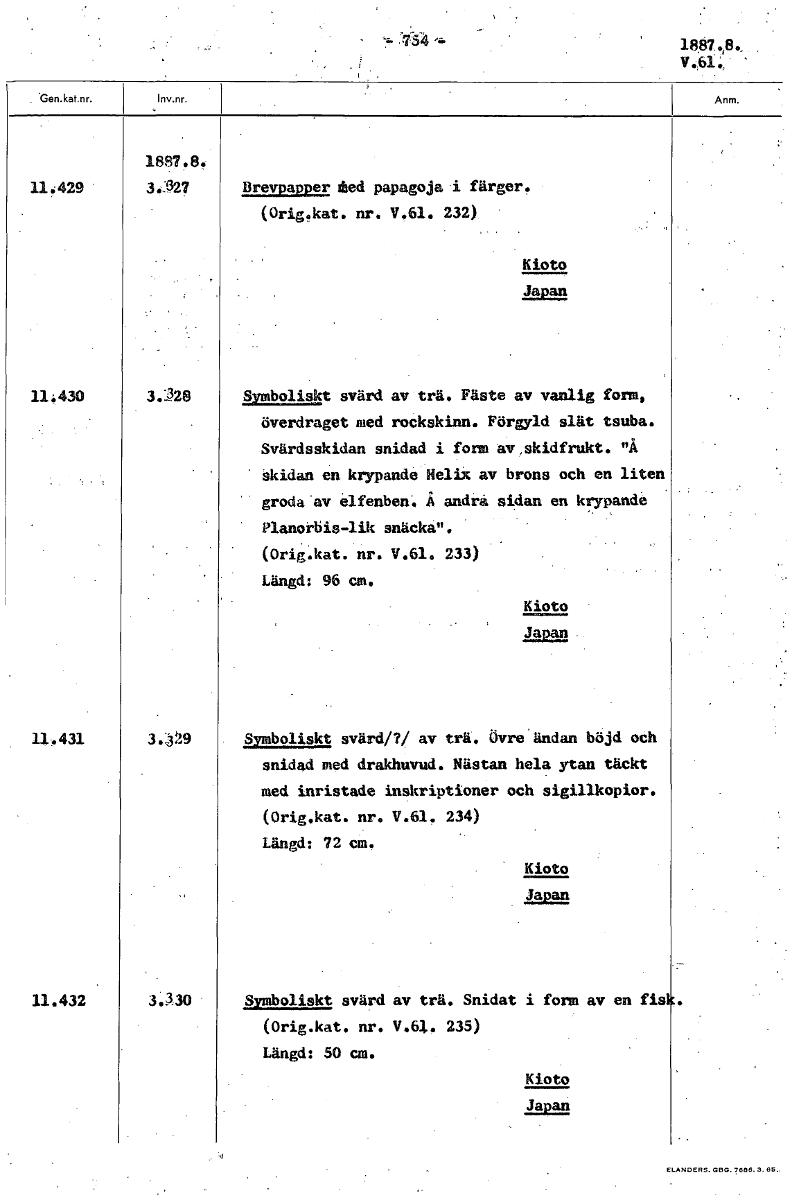 754-‘ 1887.8. V.61. 1887.8. 11:429 3.327 Brevpapper died papagoja i färger. (Orig.kat. nr. V.61. 232) Kioto Japan 11.430 3.328 Symboliskt svärd av trä. Fäste av vanlig form, överdraget med rockskinn. ...Visa hela