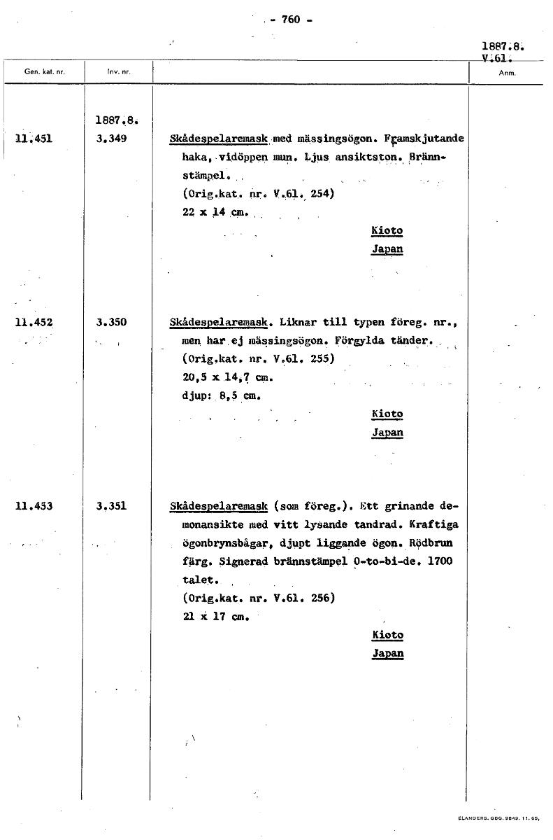 - 760 - 1887.8. V'61' 1887.S. 11:451 3.349 Skådespelaremask med mässingsögon. Framskjutande haka, vidöppen mun. Ljus ansiktston. Bränn- stämpel. (Orig.kat. nr. V.61. 254) 22 x 14 cm. Kioto Japan 11.45...