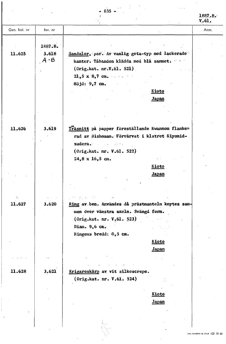 - 835 1887,8. V,.61,. 1887.8.. 11.625 3.618 Sandaler, par. Av vanlig geta-typ med lackerade kanter. Tåbanden klädda med blå sammet: (Orig.kat. nr.V..61. 521) 21,5 x 8,7 cm. Höjd: 9,7 cm. Kioto Japan 11.626 3.619 Träsnitt på papper föreställande Kwannon flanke.= rad av Bishoman. Förvärvat i klstret Kiynmid- zudera. (Orig.kat. nr. V.61. 522) 24,8 x 16,5 cm. Kioto Japan 11.62? 3.620 Ring av ben. Användes då prästmanteln knytes sam- man över vänstra axeln. Svängd form. (Orig.kat. nr. V.61. 523) Diam. 9,6 cm. Ringens bredd: 0,5 cm. Kioto Japan 11.628 3.621 Krigareskärp av vit silkescrepe. (Orig.kat. nr. V.61. 524) Kioto Japan [ocr]