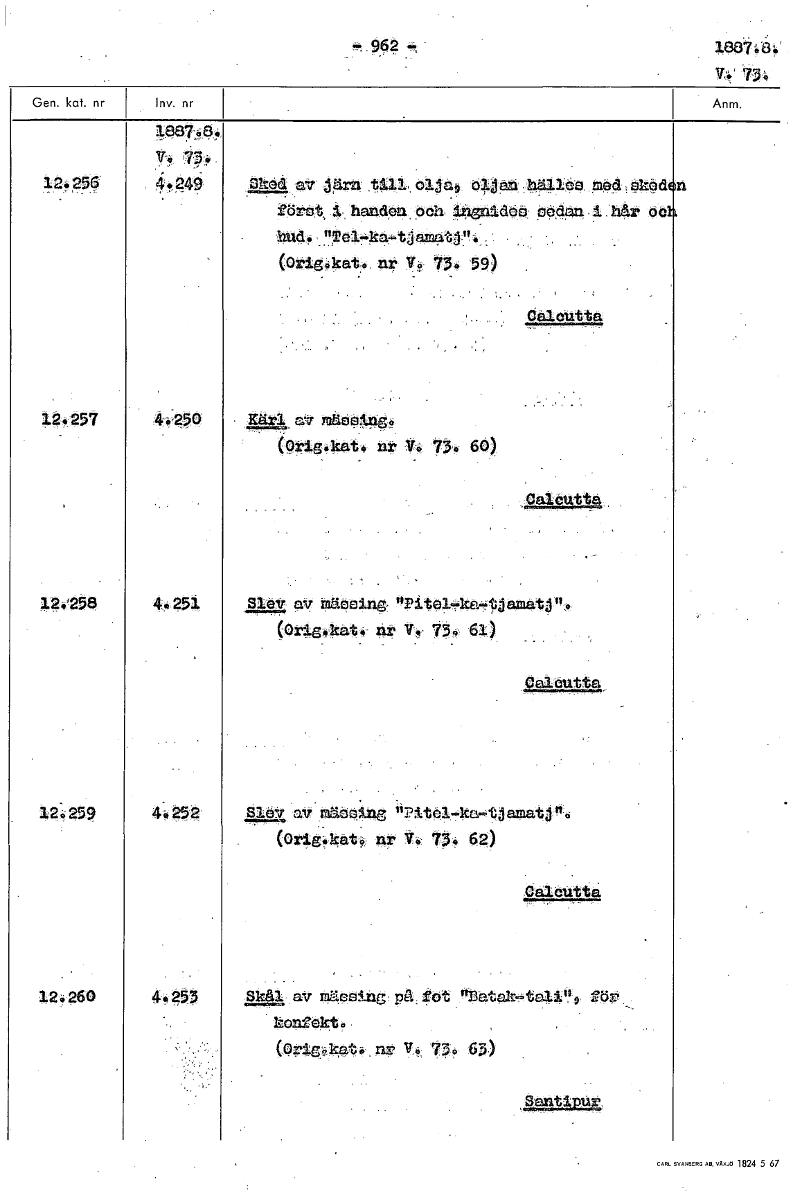 2 18&7 a 12.256 , Sked aY•4rn 411, oljat i:4044104 PO: Ok.Od n hand,au. Och g/gnida-d p0404.1 båt öö -hud. "Te1-Ra.:-tjatnr.4.te (Origt4kat:4 nr Y. 73. 59) Calcutta 12.57 400 441 ra`.. 7304.4g. (Orig.kat. nr Y. 73. 60) Calö,Utta 12258 4 251 SIeY av iglägetalot °P1t01?iikatjamat- 11 (0044-kat4- 4T Vt' 759 61) Calcutta 12-4 259 4 252 SlCV a7fl/t?ite1-7ka,43ametrh (ox'i.g.kat0 4T V, 73, 62) tilöuttå 12.260 4423 Skål av IgasinG. på,Zotn:Bataktale9 konfekt (141gkatii, .4T Vt 73? 63) [ocr]