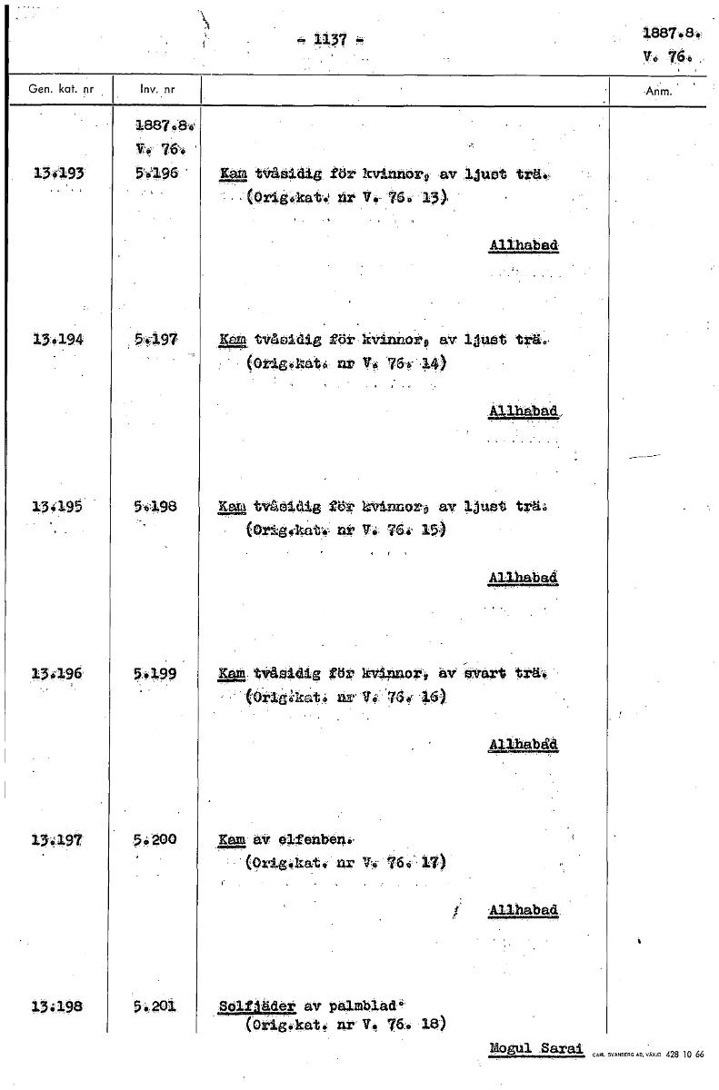 1137 2.887•8•, yo 70b 1887080' V• 764 ' 13493' 5'436 Kam .0114dig fe'r 1~11014 av ljut trät- (Oriå0katflr V. '76 13), Alihabad 13.194 58497 tväsidig för livtailort av 'jaet trä'. 0ri,g0kat4 nr Ve 76t 14) Al 138195 50198 Kan tVäaitlig Zör ktrinnoro av 1juat trä. (Qries.hats, ni, V. 76 15) Allhabad 13:196 5.199 Kw. tVgig14g för ~or', av gvart trä': (Orig.;-kat_. Vi 76:. •16) AilliabeZd 13:197 ,58.200 Kam av eIfenban., Oris.kat. nr 7 ö. Allhabad 13198 Solåder av p4mblad4 (Origehat. nr V. 76. 18) Moga1.Sarai CARL [ocr]