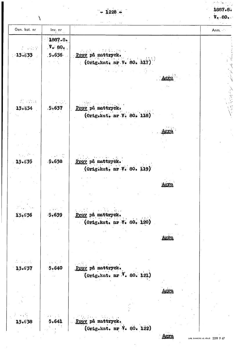 -.• 13.6'33 Prov på fattryck. 14r .kat n, V 88. kaa 13.634 .5.637 ttry0k. (6r gkat. nr,:f8144, 13.635 .5.638 Prov på ntattryök (00.8:Ikat; nr Y. 80. 119) 13.636 '5t639 på mattryck. (O ,.kat. nr .11-. 80..120) 13.636/3.6`3? 5 640 på ettryck. Orig kat. nr 121)• 800 13•6» .5.641 på mattryck.. (Orig.kaia nr eö 122) [ocr]