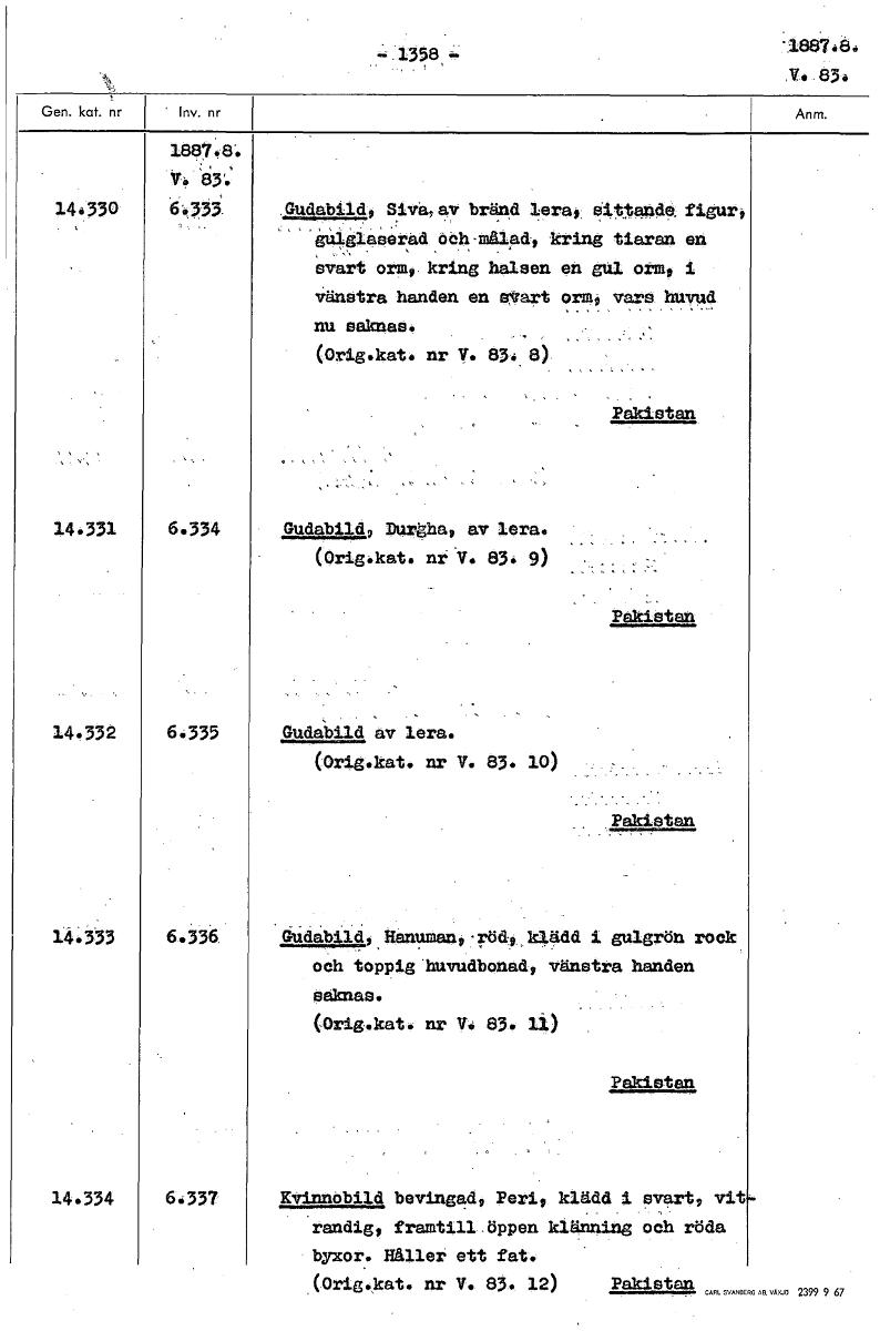 1358 veke: 14.330 .Gudabild, Sival,at bränd lerat Sittands figur, gulglaserad och målad, kring tiaren en svart ormt kring halsen en gul orm, i Vänstra handen en start orm, vara huvud nu saknas. , (Orig.kat. nr V. 83. 8) Pakistan 14.331 6.334 • Gudabild, Durgha, av lera. • (Orig.kat. nr V. 83. 9) Pakistan 14.332 6.335 Gudabild av lera. (Orig.kat. nr V. 83. 10) Pakistan 14.333 6.336 GUdabi1411anumanp-röd9,k4dd i gulgrdn rock och toppig huvudbonad, vänstra handen saknas. (Orig.kat. nr 83. li) Pakistan 14.334 6.337 Kvinnobild bevingad, Peri, klädd i svart, vit randig, framtill öppen klänning och röda byxor. Håller ett fat. (Orig.kat. nr V. 83. 12) Pakistan [ocr]