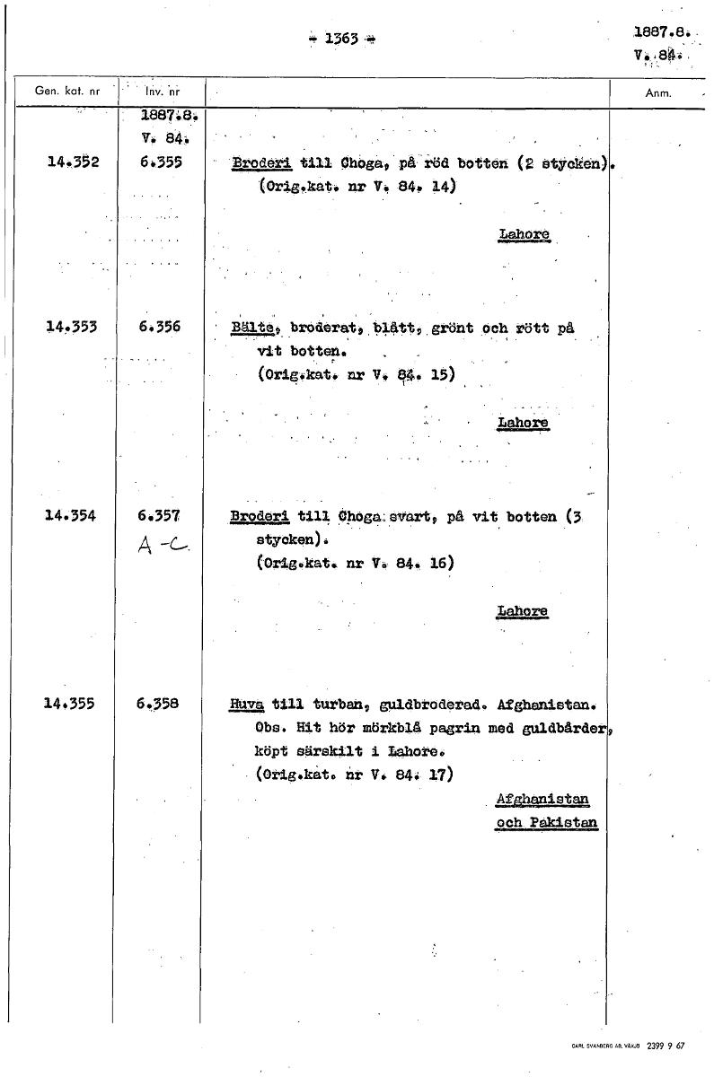- 2.363 1887.8. V. 188M. V. 84 14.352 64355 Broderi till Q-höga. På. röd botten ititYtkön) (orig!kat, nr V. 84. 14) re 14.35214”3 6.358 brederat,144tto,grönt och rött på vit botten. (Orig-ökat. nr V. er46 15) , Laholm 14354 6.357 Broderi till 9hoga:Svart. på vit botten 3 A -c- stycken). (Orig.kat. nr V. 84. 16) Lahore 14.355 6.358 Huva till turban. guldbroderad. Atshanistan. Obs. Hit hör mörkblå pagrin med guldbårde köpt särskilt i Iahore. (Otig.kat. åt V. 84. 17) AfAhanistan och Pakistan [ocr]Stäng
