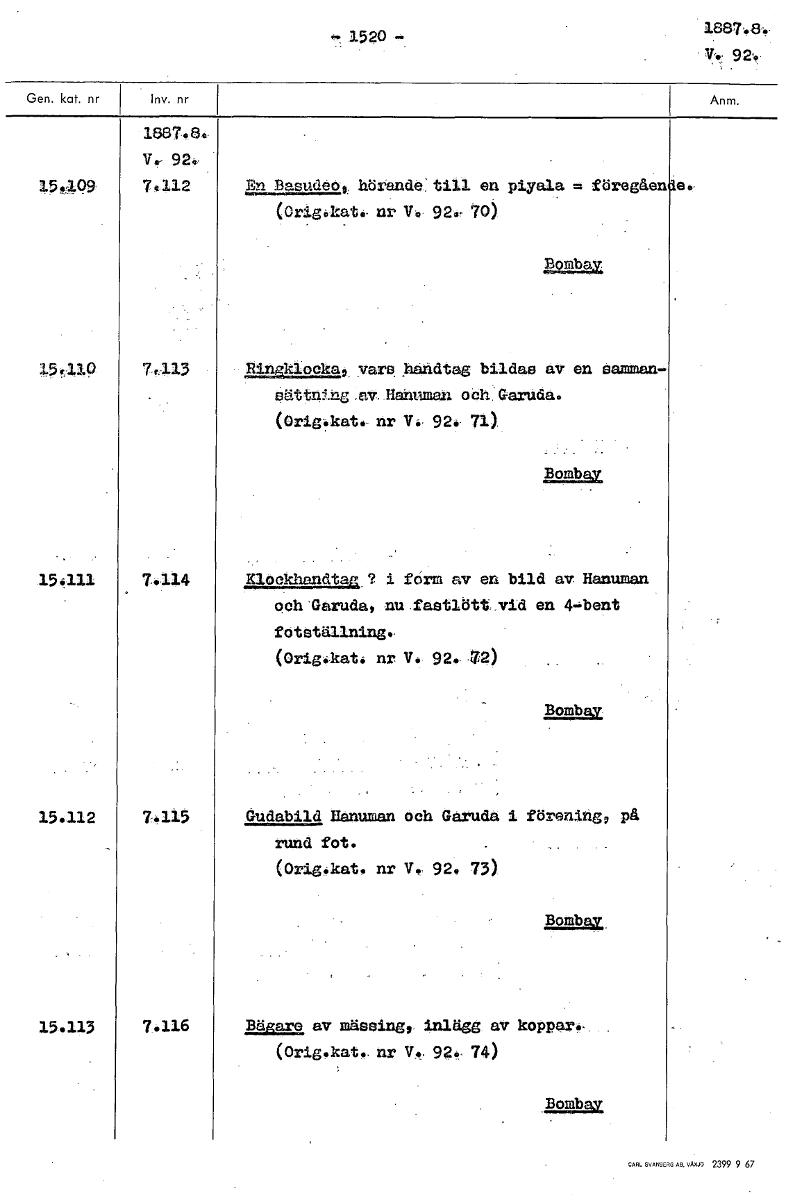 1520 - 18874. Y4,.. 92. 1867.8.- V. 92. 15.109 7.112 En Basudeoo, hörande: till en piyala = föregen e (Origölcate. nr V. 92.- 70) 13.92..0 7,113 13.132a___locka p vars handtag bildas av en saunan- Sä'...