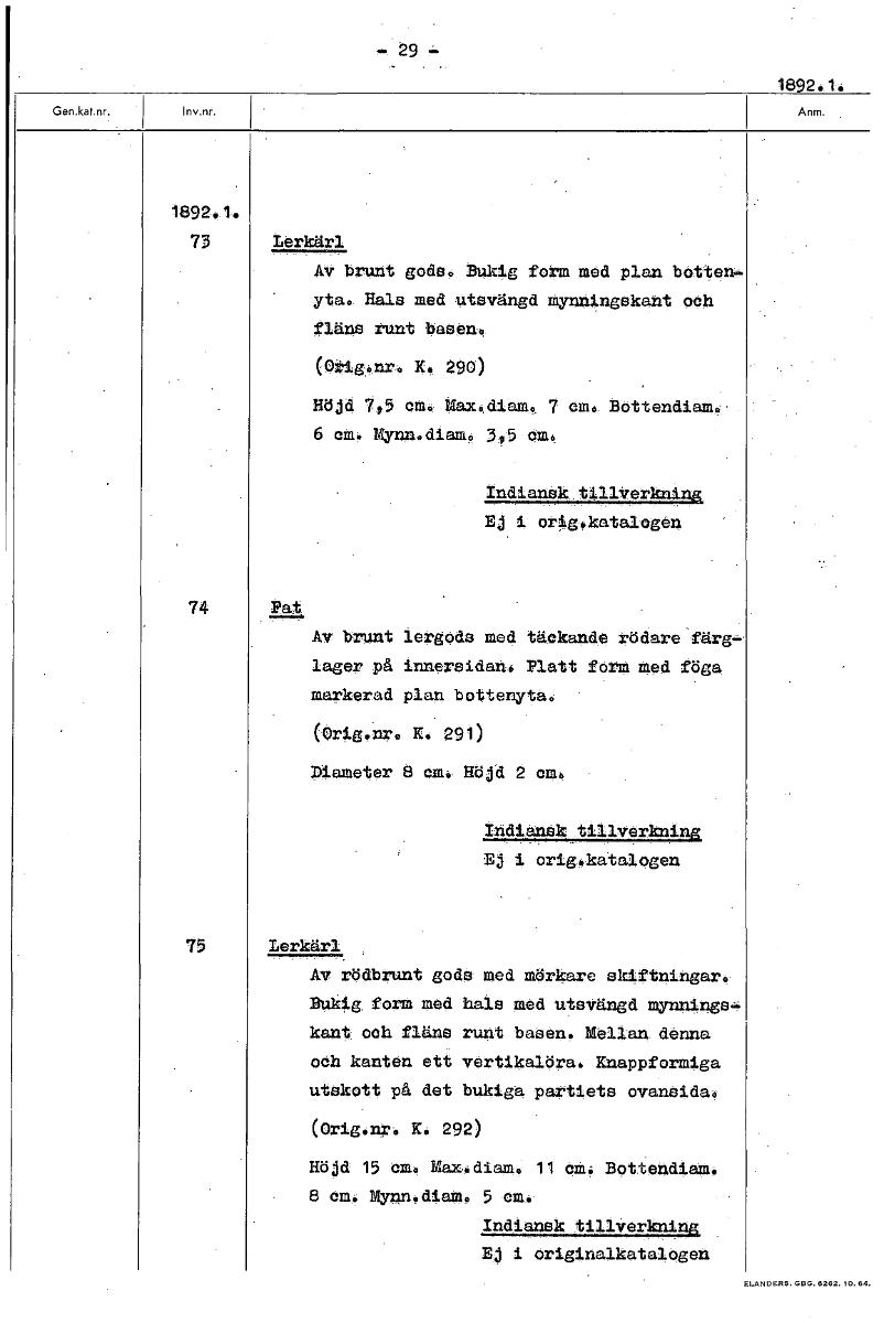 29 - 1892 . 1. 1892.1. 73 Lerkärl Av brunt gods. Bukig form med plan botten.. yta. Hals med utsvängd mynningskant och flänå runt basen. (Orig.nr. K. 290) Höjd 7,5 em. Max. diam. 7 cm ° Bottendiam. 6 cm. Mynn.diam. 3,5 cm° Indiansk tillirerknizn. Ej i orig.katalogen 74 Fat Av brunt lergods med täckande rödare färg- lager på innersidan. Platt form med föga markerad plan bottenyta. (0114.nre K. 291) Diameter 8 cm. Höjd 2 cm. Indiänek tillverkning Ej i origekatalogen 75 Lerkärl Av rödbrunt gods med mörkare skiftningar. Bukig form med hals med utsvängd mynn4ngs kant och fläns runt basen. Mellan denna och kanten ett vertikalöra. Knappformiga utskott på det bukiga partiets ovansida. (Orig.nr. K. 292) Höjd 15 cm. Mar.diam. 11 et. Bottendiam. 8 cm. Mynnediam. 5 cm. Indiansk tillverkning Ej i originalkatalogen [ocr]Stäng