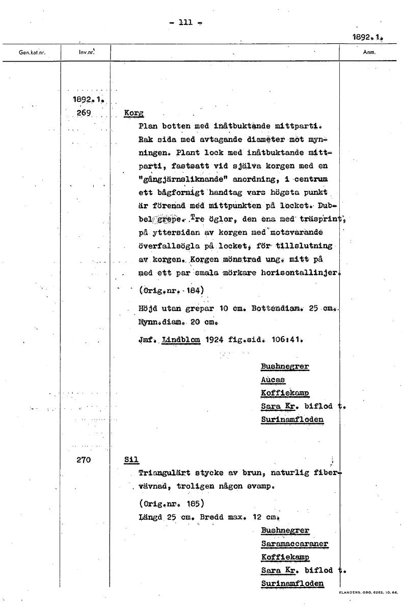 1892. 1.. 1892r,1 !) 269 Korg . Plan botten med inåtbuktande mittparti. Rak sida med avtagande diamter-met myn- ningen. Plant lock med inåtbuktande mjtt- parti, fastsatt vid själva korgen med en ngångjärnallknanden anordning, i centrum ett bågfol44.0t.handtag vars högsta punkt är förenad med dittpUnkten på locket. Dub- bekjgrepee.Tre öglor, den ana med`träsptin på yttersidan av korgen meemettvarande överfailsögla på locket, för tillslutning av korgenorgen mönstrad ung. mitt på med ett par smala mörkare horisontallinjer (örig.nr.-1S4) Höjd utan grepar 10 öm. Bottendiam, 25 au. Mynnådiamo 20 om.. 4mf,Lindblom 1924 fig.sid.. 106141. Bushnegrer AUcas Koffiekamp Sara Kr, biflod Sutinamfioden 270 Sil Triangulärt stycke av brun, naturlig fibe vävnad, troligen n on Svamp. (Orig.nr. 135) längd 25 cm, Bredd max. 12 uh! Bushne&rer Saramaccaraner Koffiekamp Sara Kr. biflod Surinamfloden [ocr]