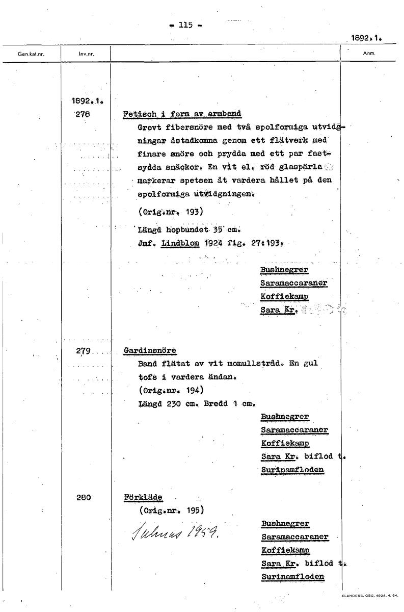 1892.1. 1892.1. 278 Fetiach i form av, armband Grovt fibersnöre med två spolformiga utvi ningar åstadkomna genom ett flätverk med finare snöre och prydda med ett par fast- eYdda cmäCkor. En vit cl* röd gletegkrla markerar spetsen åt vardera hållet på den spolformiga utVidgningen1 (Orig'.mr. 193) Längd hopbUndat:35'.cm,> Lindblom 1924 fig. 27s193. Bushnegrer S aramac c araner Koffiekamp Sara Kr, _ 279.... Gardinenöre Band flätat av vit momullstråd. En gul tofs i vardera ändan* (Oria:nr. 194) Längd 230 om. Bredd 1 om. Bushnegrer Saramacearaner Koffiekamp Såra Kr. biflod Surinamfloden 280 Förkläde , (orig.mr. 195) Bushnegrer /k9, Saramacoaraner Koffiekamp Sara. Kr. biflod Surinamfloden [ocr]Stäng