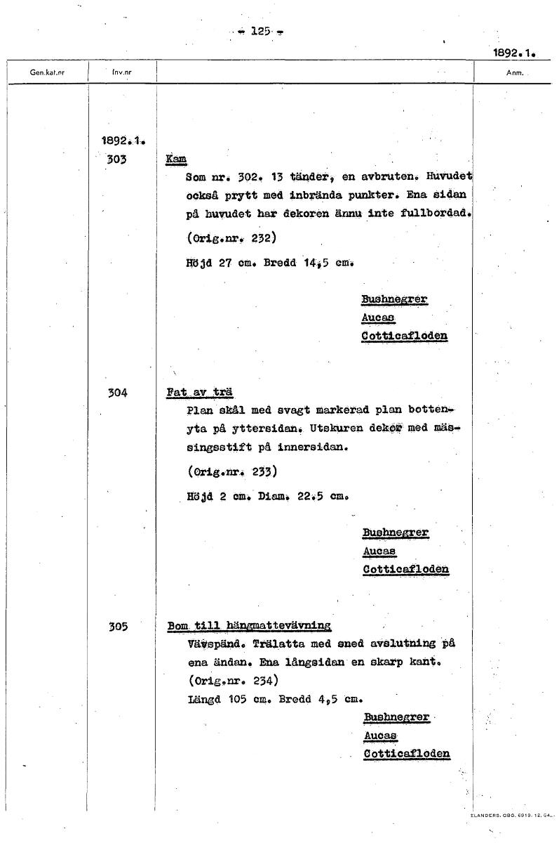 .4 125. 4. 1892.1. 1892.1 303 Ram Som nr. 302. 13 tänder, en avbruten. HUudet också prytt med inbrända punkter. Ena sidan på huvudet har dekoren ännu inte fullbordad. (Orig./ar•' 232) Höjd 27 em. Bredd 14p5 em. BuOtenegrer Aucas 0ottlea£10den 304 Pat_av trä Plan skål med svagt markerad plan botten.. yta på yttersidan. Utskuren dekot med mäo- oingostift på innersidan. (Orig.nr. 233) Höjd 2 em. Diam. 22.5 em. Bushnegrer Aucas Cotticafloden 305 till ViliglAndo Ttälatta med sned avslutning 'på ena ändan. Ena långsidan en skarp kant. (Orig.nr. 234) Längd 105 em. Bredd 4s5 cm. Bushnetrer Auras 0otticafloden [ocr]Stäng