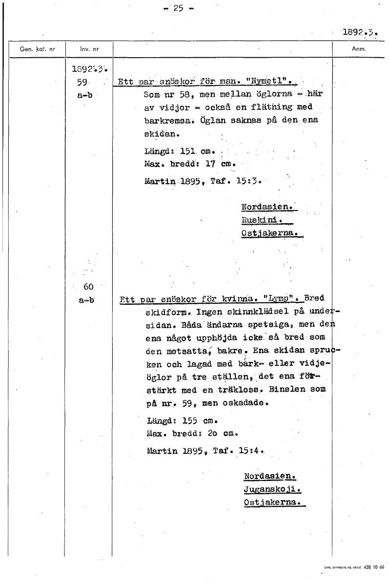 25 1892.3. 1892".. 59 Ett par snöskor: för man N eti". a-b Som nr 589 men mellan öglorna här av vidjor - också en flätning med barkremsa. Öglan saknas på den ena skidan. Längd: 151 cm. Max. bredd: 17 'cm. Martin 18959 Tar. 15:3. Nordasien. Ruskini. OstJakerna. 60 a-b Ett par snöskor för kvinna. "Ilvmp". Bred skidform. Ingen skinnklädsel på uncle sidan. Båda ändarna spetslga9 men de ena något upphöjda icke' så bred som den motsatta; bakre. Ena skidan spru ken och lagad med bark- eller vidje- öglor på tre ställen9,det ena föt- stärkt med en träkloss. Binelen som på nr. 599 men oskadade. Längd: 155 cm. Max. bredd: 20 cm. Martin 18959 Taf. 15:4. Nordasien. 'iRang119111 pstjakerna. [ocr]Stäng