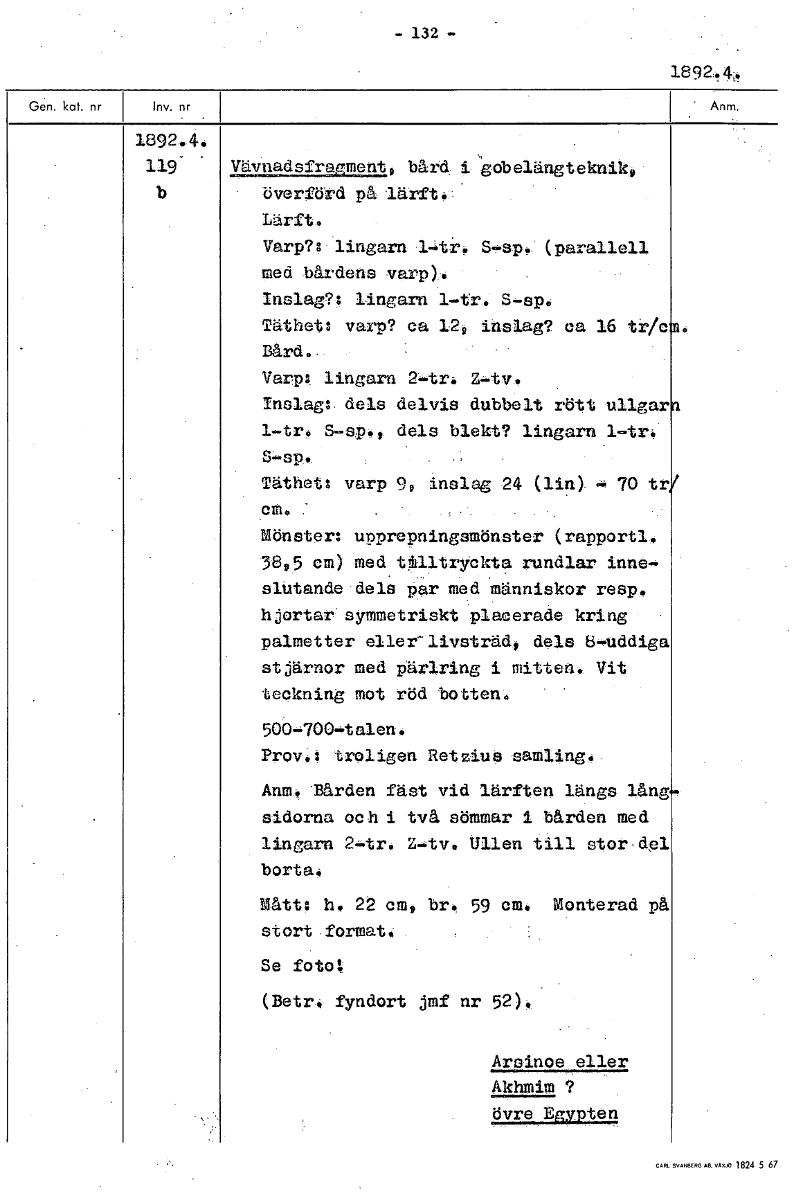 — 132 — 1892!4 1892.4. 119- Vävnadsfraement9 bård i gobelängteknik9 b överförd på lärft. Lärft. Varp?: lingarn 1-tr. S.-sp. (parallell med bårdens varp). Inslag?: lingarn 1-tr. S-ep. Täthet: varp? ca ...Visa hela