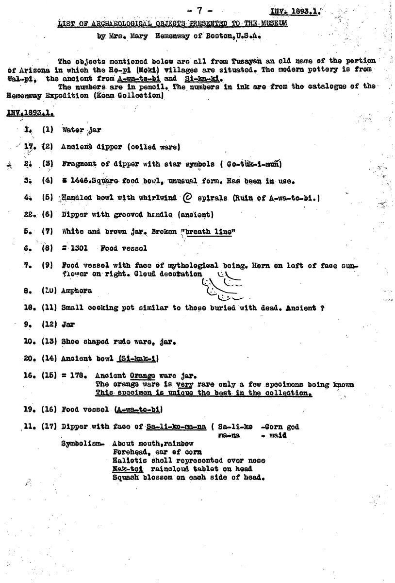 The objeots mentioned below are all from Twayan an old name of the portion' «Arizona in which the 8o,pi (Moki) willageo are situated. The =dorn pottery Is from Wal°30.4 the anoleut freniA~to-bi and phtmeää The ~here are in penell., Thanumbers in ink are from the omtalogue of the Bamenway ExPedition (Sean Collection) INV.1693.1. 3. (1) Water ar 12) Analent diPpar (0011ed ware) , 21 (3) Pragment of dipper with star 'symbols ( (4) 3 144605qUarafood botyl. unusual förrn. Has been in uso. 41 (5) yHandled bowl with whirlwiM @ spirals Otuin of A.uvsto-ind ge (6) 31Pper with arom.. handla (anaient) 5. (7) White and brown klar 'koken rbreath linor 6. (6) = 1301 Food vessel 7. (9) Hood ~sel with face Of mythologioal belag. Horn on loft of face sun. floTer on-right. Gled deootation k1K__ 6. (W) Amphora 16. (11) Small °ock:ing pot similar to thoee buried'w1th dead.am°1ent 9. (12) Jar 10. (13) Shce shaped ruda ware. åar. 40. (14) Ancient bowl (SI.Xak.1) 16. (15) = 178. AnOlent Orange ware jar. The orange ware is Y= rare .024 a few specimens helna km= Thiasueolmen Is_micua the best in the collection, 19. (16) gotd vessel-(A.wa.to.b1) ,11. (17) Dippar .with face ofga.11.ko-ma.na ( Sa-11-ko .0orn god ma.na mald Symbolism. About mouth,rainbow FOrehaad, ear of dorn Haliotis Shell repretented over noa° Hak-tok raincloud tablet on kvad Squaph bloseon on mich side of hesa. [ocr]Stäng