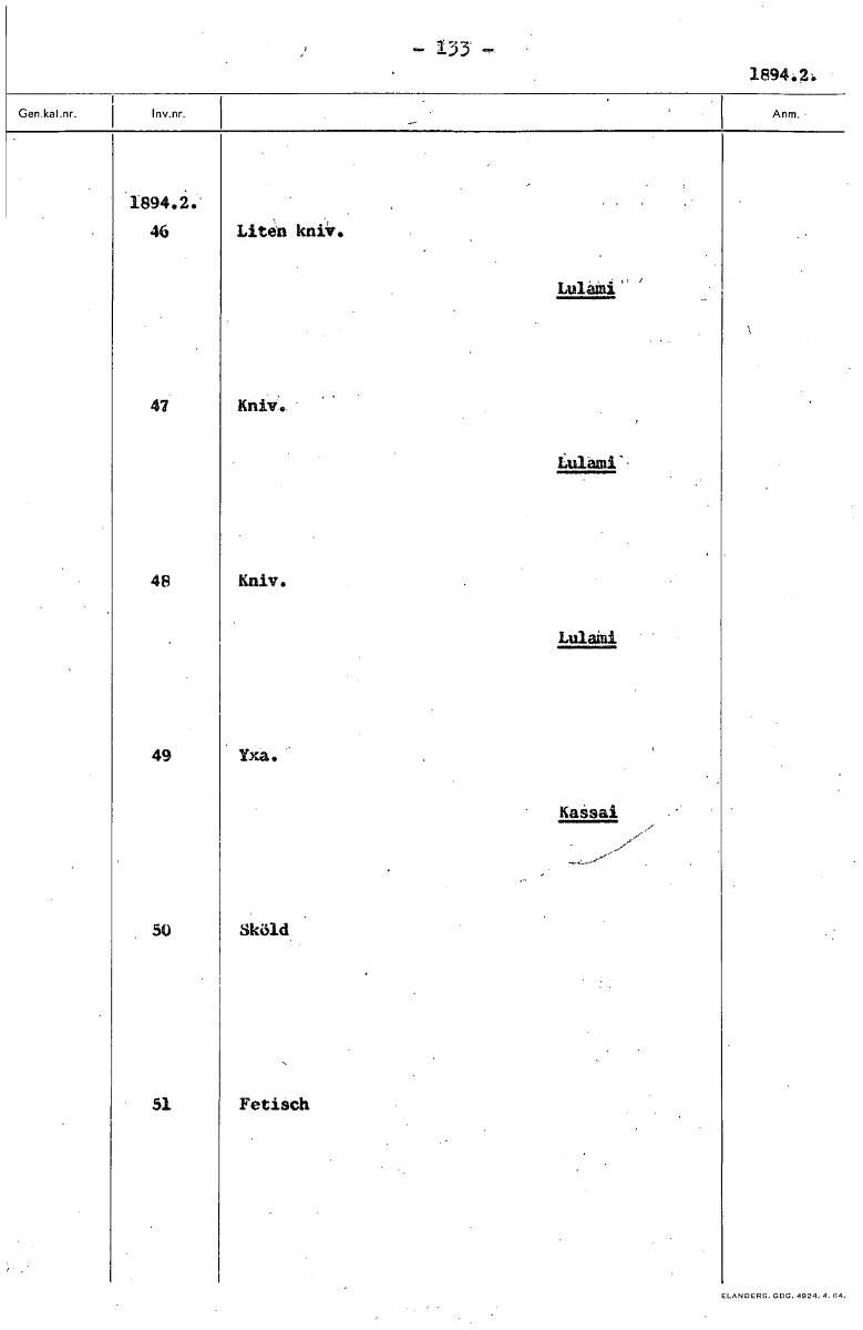 • 135 — 1894.2: '1894.2.' 46 Liten kniV. Lulaini 47 Kniv. Uland- - 48 Kniv. Lulaini 49 Yxa. Kaasal 50 Sköld 51 Fetisch [ocr]
