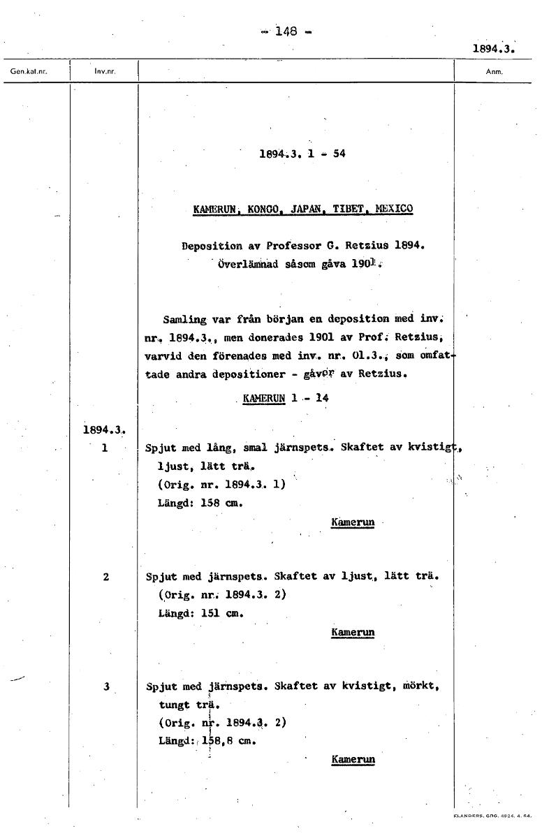 - 148 - 1894.A.' 1894.3. 1 ••• 54 KAMERUN, KONGO, JAPAN, TIBET, MEXICO Deposition av Professor G. Retzius 1894. Överlämnad såsom gåva 1901. Samling var från början en deposition med 'ny. nr. 1894.3., ...