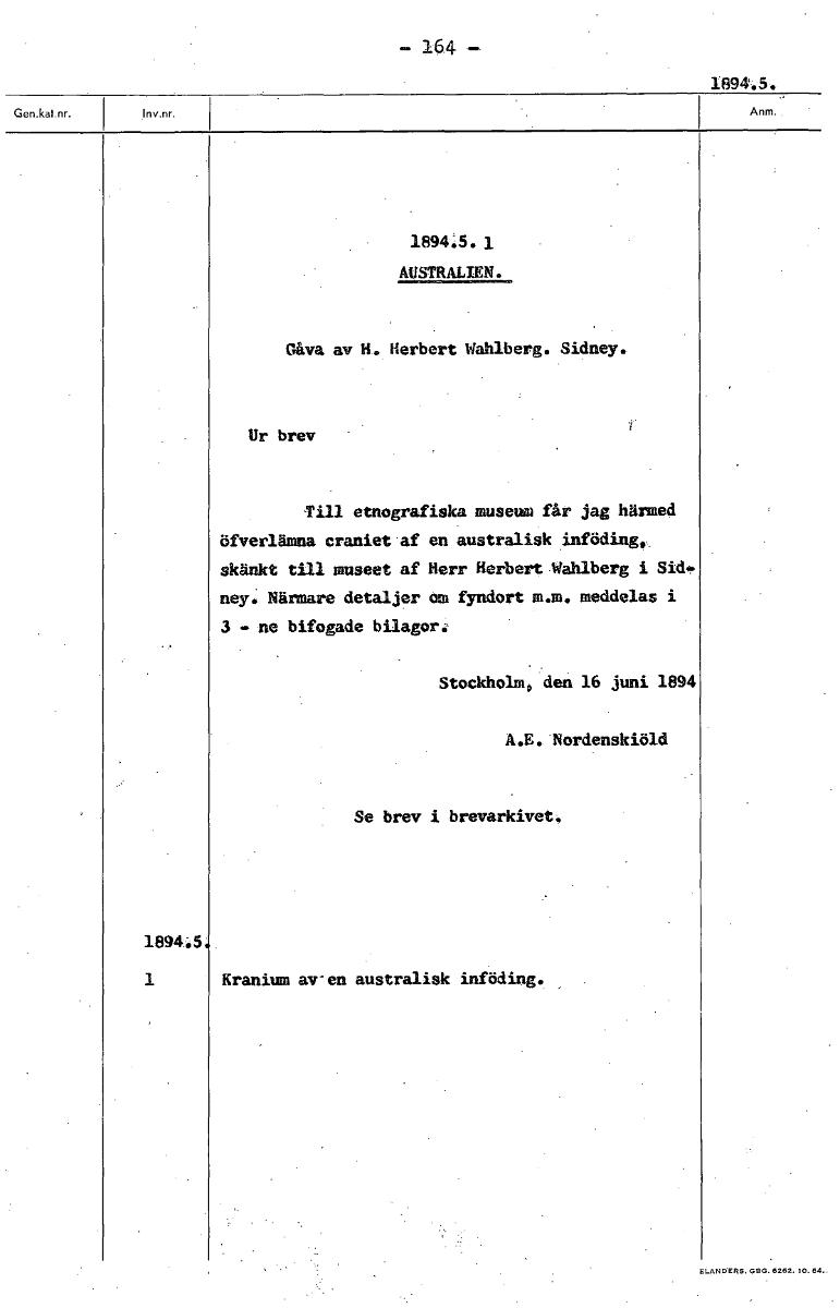 • - 164 - 1894.5. 1894:5. 1 AUSTRALIEN. Gåva av R. Herbert Wahlberg. Sidney. Ur brev Till etnografiska museum får jag härmed öfverlämna craniet af en australisk inföding, skänkt till museet af Herr Herb... Visa hela