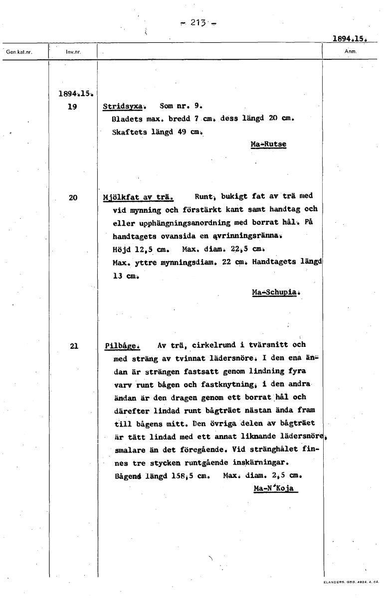 • 213 1894.15. 18944154 19 Stridsyxa,. Som nr. 9. Bladets max. bredd 7.cm4 dess längd 20 cm. Skaftets längd 49 cm. Ma-Rutse 20 Mjölkfat av trä. Runt; bukigt fat av trä med vid mynning och förstärkt kant... Visa hela