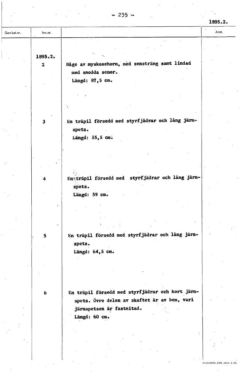 - 235 -- 1895.2. 1895.2. 2 Båge av myskoxehorn, med sensträng samt lindad med snodda senor. Längd: 87,5 cm. 3 En träpil försedd med styrfjädrar och lång järn- spets. Längd: 55,5 cm. 4 Enträpil försedd...