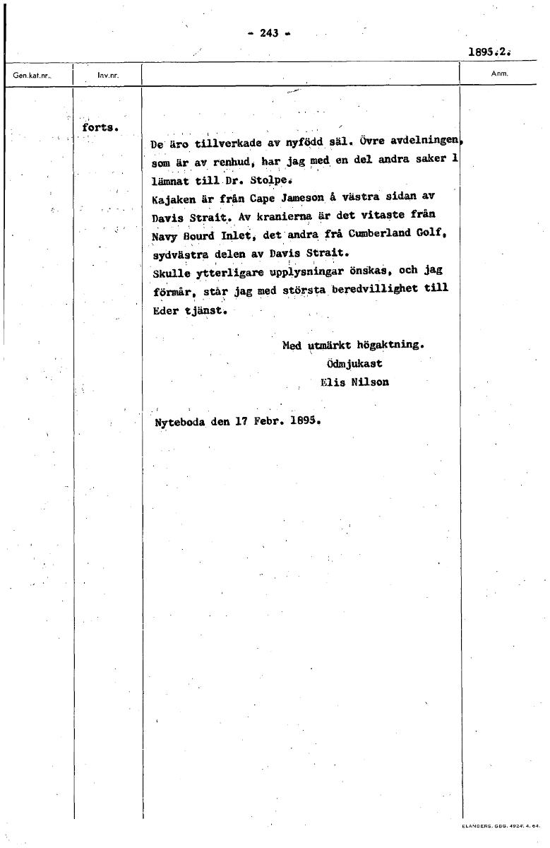 -243. 1895.2. forts. De äro tillverkade av nyfödd säl. övre avdelningen som är av renhud, har jag med, en del andra saker 1 lämnat till:Dr. Stolpe. Kajaken är från Cape Jameson å västra sidan av Davis Strait. Av kranierna är det vitaste från Navy Dourd Inlet, det-andra frå Cumberland Golf, sydvästra delen av Davis Strait. Skulle ytterligare upplysningar önåkaå, och jag förmår, står jag med största beredvillighet till Eder tjänst. Med utmärkt högaktning. ödmjukast Elis Nilson Nyteboda den 17 Febr. 1895. [ocr]