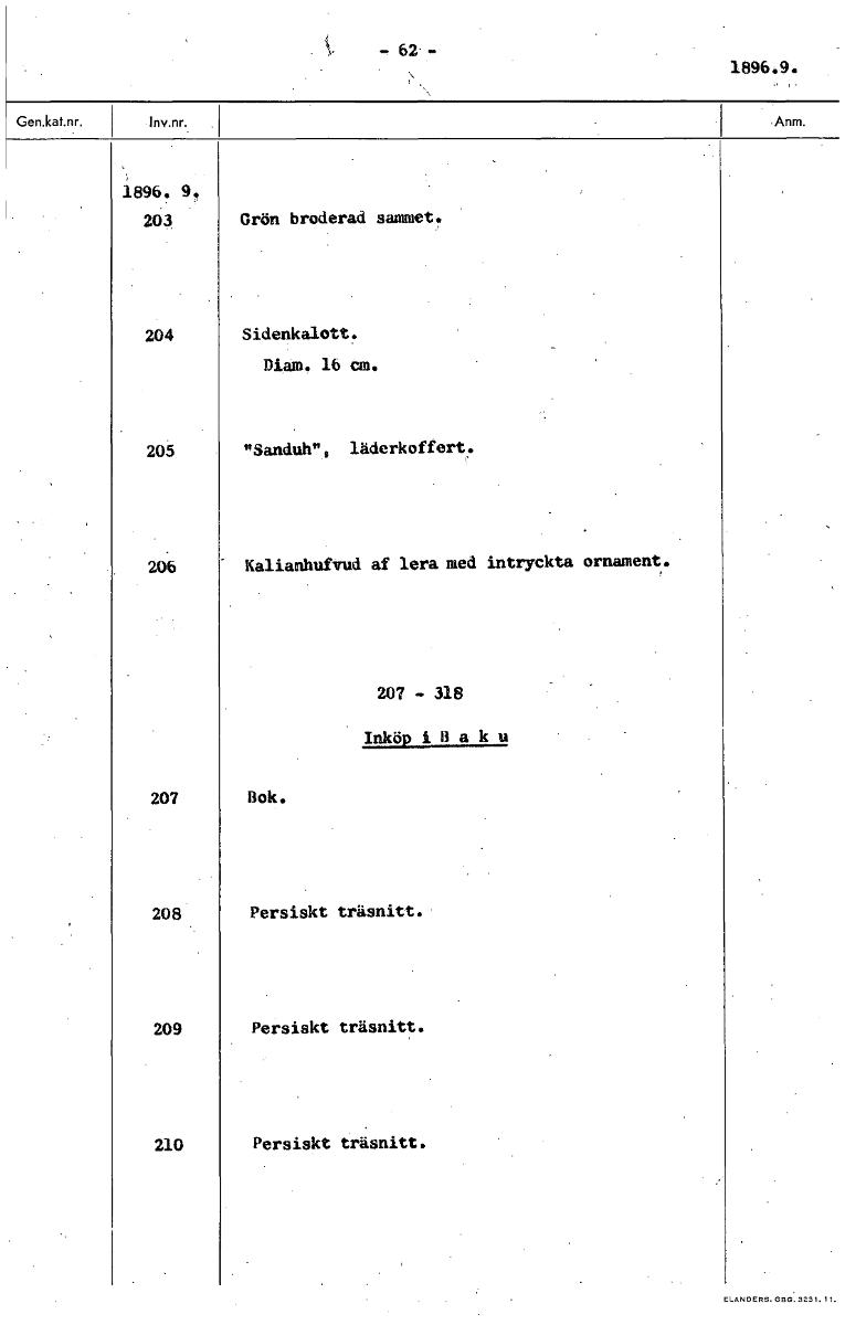 • 62 - 1896.9. 1896. 9. 203 Grön broderad sammet. 204 Sidenkalott. Diam. 16 cm. 205 "Sanduh"0 läderkoffert. 206. Kalianhufvud af lera med intryckta ornament. 207 - 318 Inköpillaku 207 Bok. 208 Persiskt ... Visa hela