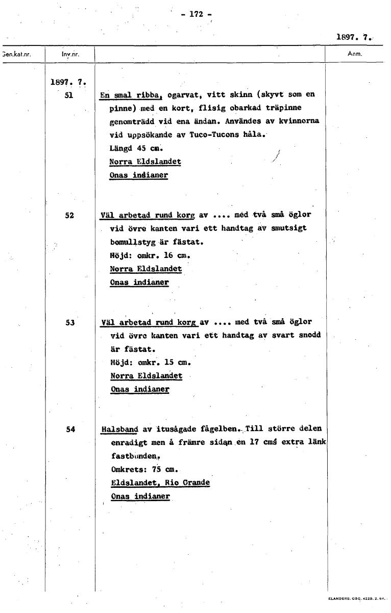-172- 1897. 1897. - 51 En smal ribbat ogarvat, vitt skinn (skyvt som en pinne) med en kort flisig obarkad träpinne genomträdd vid ena ändan. Användes av kvinnorna vid uppsökande av Tuco-Tucons håla. Längd 45 cm. Norra Eldslandet Onas indianer 52 Väl arbetad rund korg av .... med två små öglor vid övre kanten vari ett handtag av smutsigt bomullstyg är fästat. Höjd: omkr. 16 cm. Norra Eldslandet Onas indianer 53 Väl arbetad rund korg av .... med två små öglor vid övre kanten vari ett handtag av svart snodd är fästat. Röjd: omkr. 15 cm. Norra Eldslandet Onas indianer 54 Halsband av itusågade fågelben.:Fill större delen enradigt men å främre sidan en 17 cmå extra länk fastbunden. Omkrets: 75 cm. Eldslandet, Rio Grande Onas indianer [ocr]Stäng