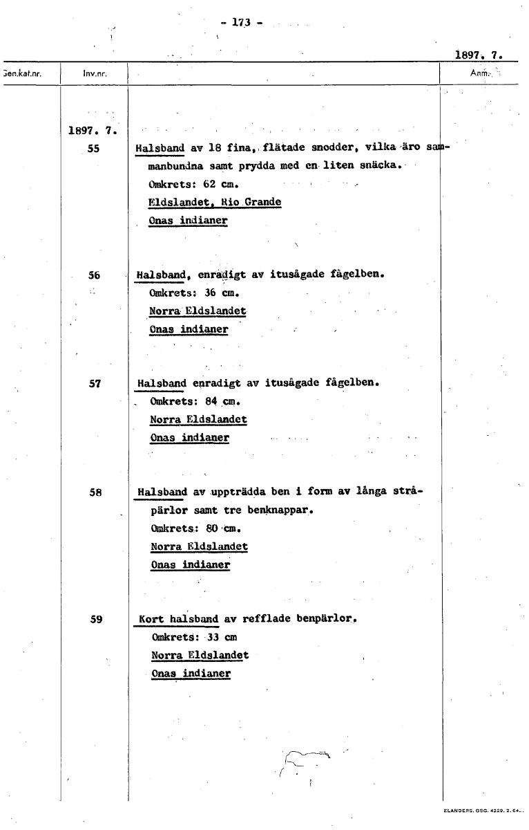 - 173 - 1897. 7. 1897. . 55 Halsband av 18 fina,,flätade snoddar, vilka äro s manbundna samt prydda med en liten snäcka. Omkrets: 62 cm. Eldslandet. Rio Grande Onas indianer 56 Halsband, enrädigt av i...