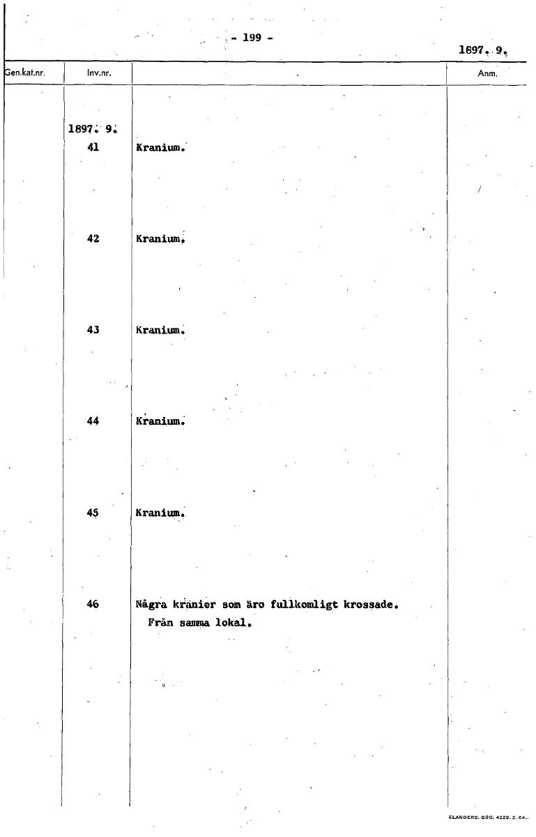 • -199- 1897. 9. 1897: 9: 41 Kraniwn. 42 Kranium: 43 Kranium. 44 Kranium. Kranium.. 46 Några kranier som äro fullkomligt krossade. Från samma lokal. [ocr]