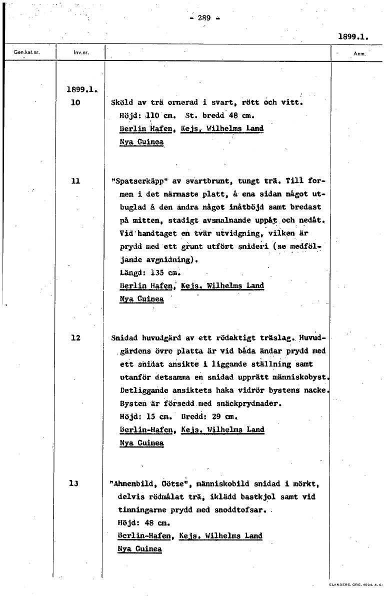 289 1899.1. 1899.1. 10 Sköld av trä ornerad i svart, rött och vitt. Höjd: 110 cm. St. bredd 48 cm. Berlin åafen, Kejs, Wilhelms Land Nya Guinea 11 "Spatserkäpp" av svartbrunt, tungt trä. Till for- men...