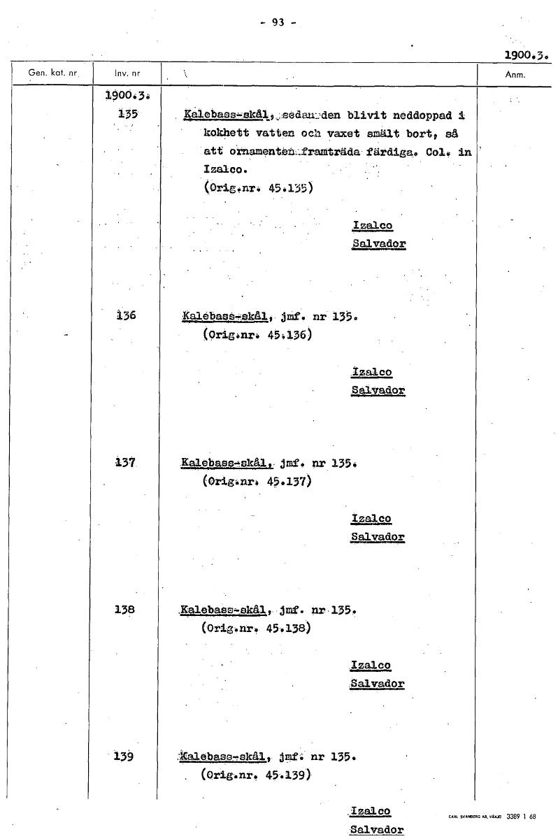 -93- 1900.3. 1900.3. 10• Kalebass,,skål,,,sedaulden blivit neddoppad kokhett vatten och vaxet smält bort: så att ornamenten...framträda färdiga. 0016 in Izalco, (Origönr. 45.135) Izalco palvador 136 Kalebassakåll jnif. nr 135. (Prigidar. 454.36) Izalco Salvador 137 Kalebass-Tskål, jmf. nr 135. (Orig.nr. 45.137) Izalco Salvador 138 ,Kalebass.-E3kål, jmf. nr 135. (Orig.nr. 45.138) Izalco Salvador 139 riCalebass.t.skåll jmf: nr 135. (Orig.nr. 454139) .I0alco Salvador [ocr]