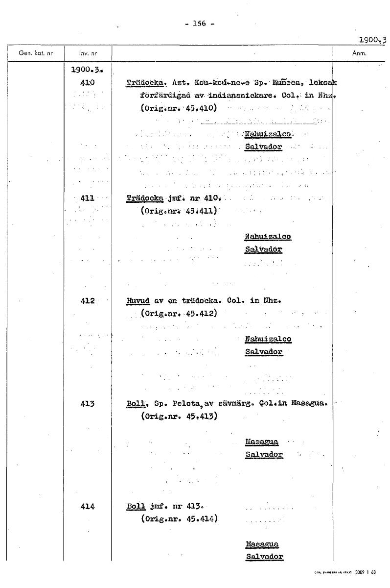 • -156- 1900.3m 410 Trädooka. Azt. Ktu-koli-ne-o Sp. Vidgeoa9 leks förfärdigad av lndiansflickare. (Orig.nr. 45.410 H-Nehuizalco SelVador 411 Trädooka jmf. nr 410. (Orig.iar4 454411) Nahuizaloo SalVador... Visa hela