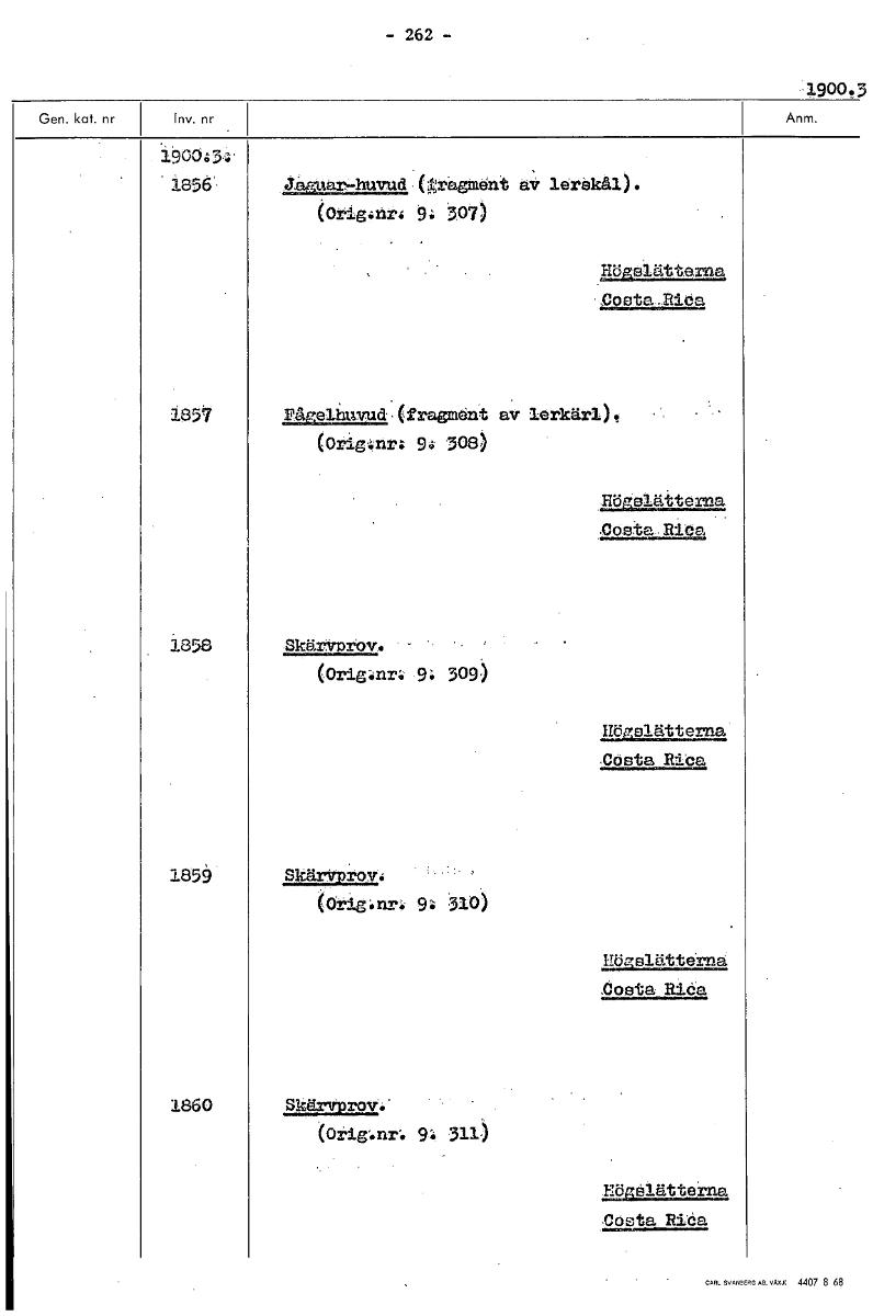 • - 262 - •1900.3 i90034' Jaguar-huvud:Cgragment av lerskål). (Orig4hr4 9: 307) Högslätterna .posta .Rica 1851 nagelimvudl(fragment av. lerkärl). (Orignr; 94 308) raplakterna Costa Rica 1858 453kärtmrov... Visa hela