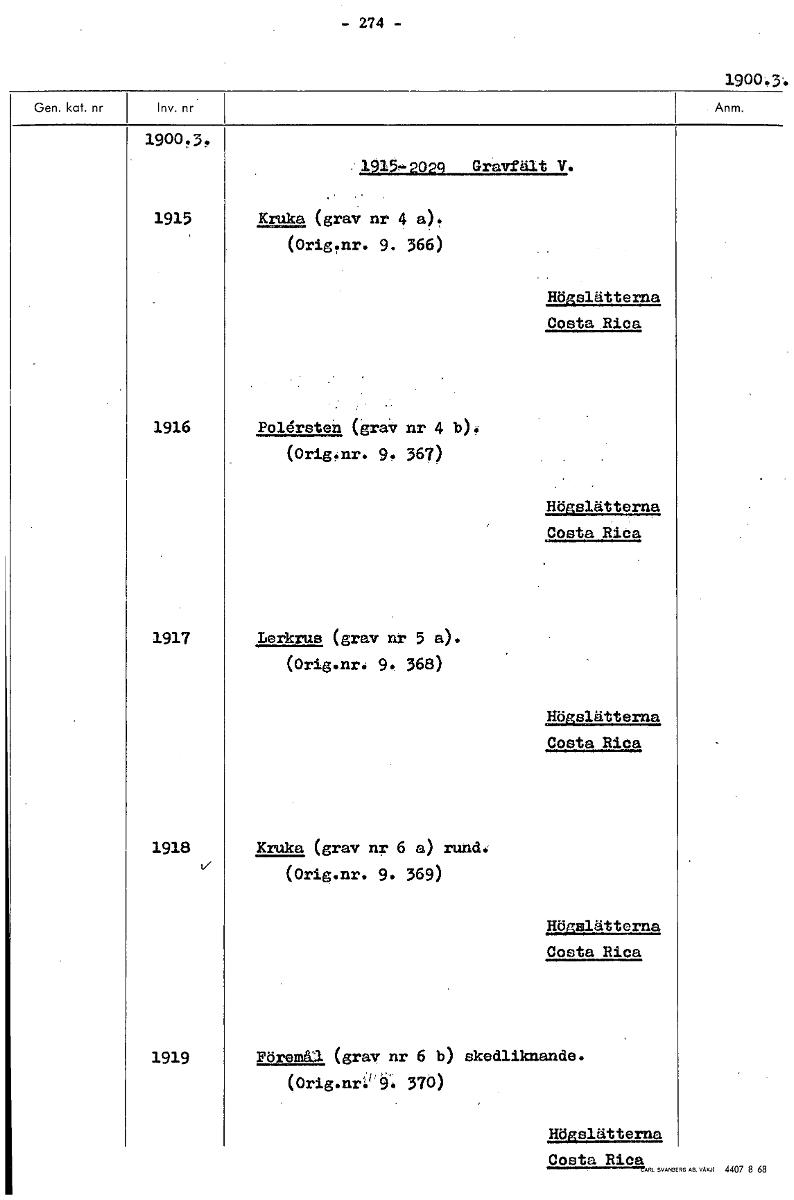 • - 274 - 1900.3'. 1900.3. , 1915-202q Gravfält V. 1915 Kruka (grav nr 4 a). (Orig.nr. 9. 366) Högslätterna Costa Rica 1916 Polersten (graV nr 4 b). (Orig.nr. 9. 367) Högslätterna Costa RiCa 1917 Lerkru... Visa hela