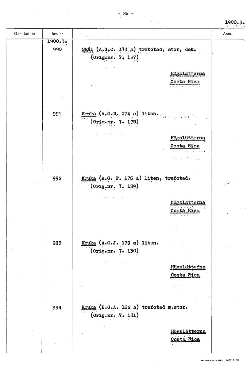 • - 86 - 1900.3. 99Q Skål ‹A.G.C. 173.a) trefotad stor dek. . (Orig.nr: 7. 127) 49221ätkella dorAa Rica 991 Kruka (A.G.p.., 174 a) liten., —COrig.nr. 7. 128) laelaitenaa Costa Ric:a " 992 KrUka (A.G. P.... Visa hela