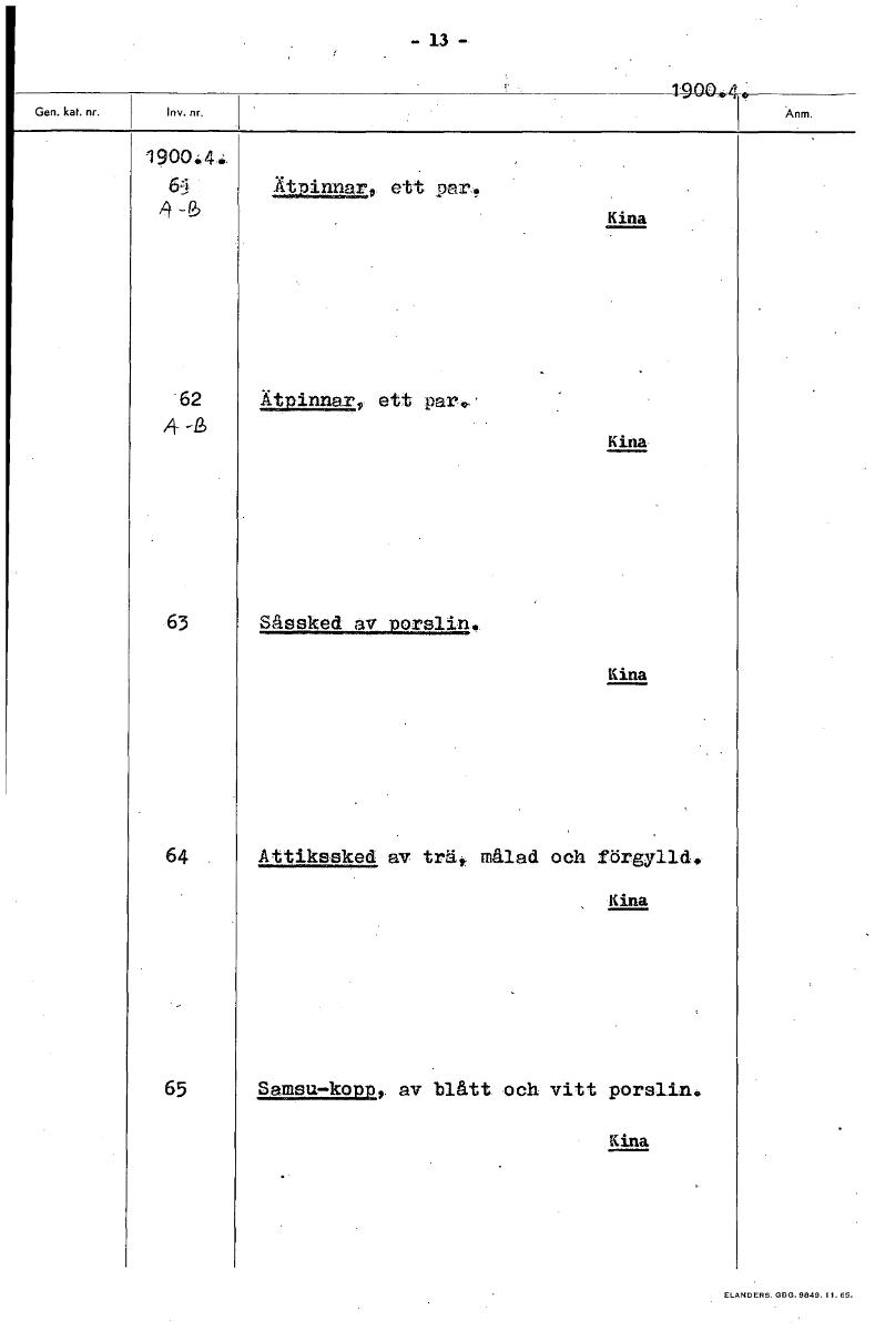 • - 13 - 1900.4 Ätpinnar, ett par. Kina •62 Ätpinnar, ett par.. -12) Kina 63 Såssked av porslin. Kina 64 Attikszked av trä.* målad och förgylld. Kina 65 Samsu—kopp, av blått och vitt porslin. Kina [ocr]