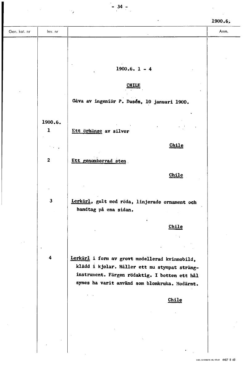 34- 1900,6j 1900.6. 1 - 4 CHILE Gåva av ingenjör P. Dusdn, 10 januari 1900. 1900.6. 1 Ett örhänge av silver Chile 2 Ett genomborrad sten Chile 3 Lerkärl, gult med röda, linjerade ornament och handtag på ena sidan. Chile 4 Lerkärl i form av grovt modellerad kvinnobild, klädd i kjolar. Håller ett nu stympat sträng- instrument. Färgen rödaktig. I botten ett hål synes ha varit använd som blomkruka. Modärnt. Chile [ocr]