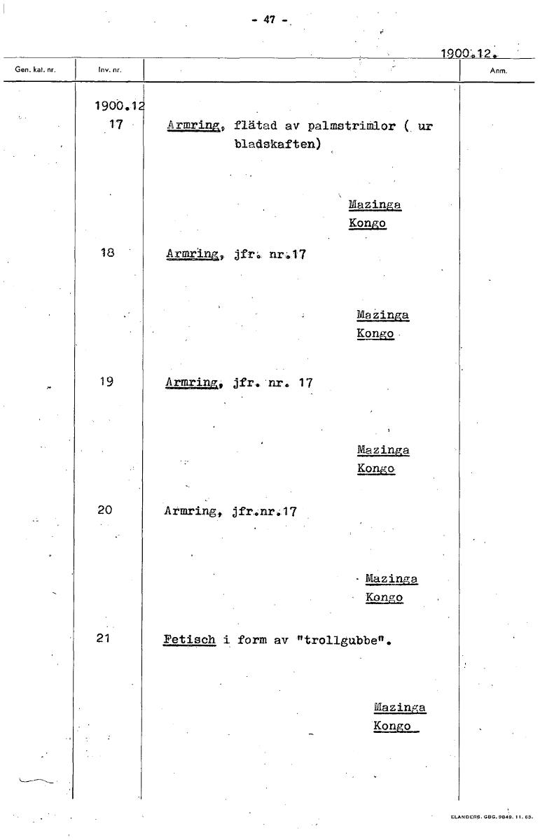 47 1900124.: 1900.1 17 Armring9 flätad av palmstrimlor ( ur bladskaften) Mazinga Kongo 18 Armring, jfr nr.177 Mazinga Kongo, 19 Armring, jfr. nr. 17 Mazinga Kongo, 20 Armring,, jfr4nr,..17'. -äää1nalä äää1naläKonto 21 Fetisch i form av trollgubbe". Mazinga Kongo [ocr]