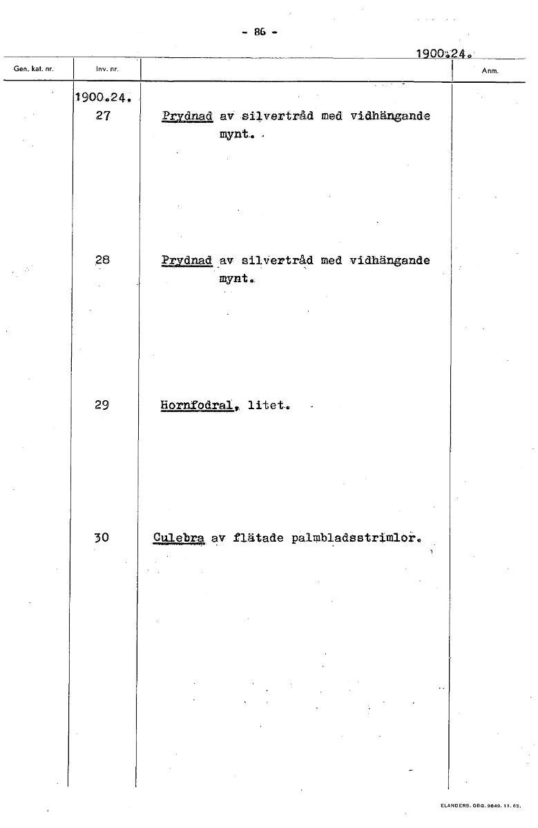 • - 86 - 1900124. 1900.244 27 Prydnad av silvertråd med vidhängande mynt. 28 Prydnad av silvertråd med vidhängande mynt. 29 Hornfodral, litet. 30 Culebra av flätade palmbladestriml0r4 [ocr]
