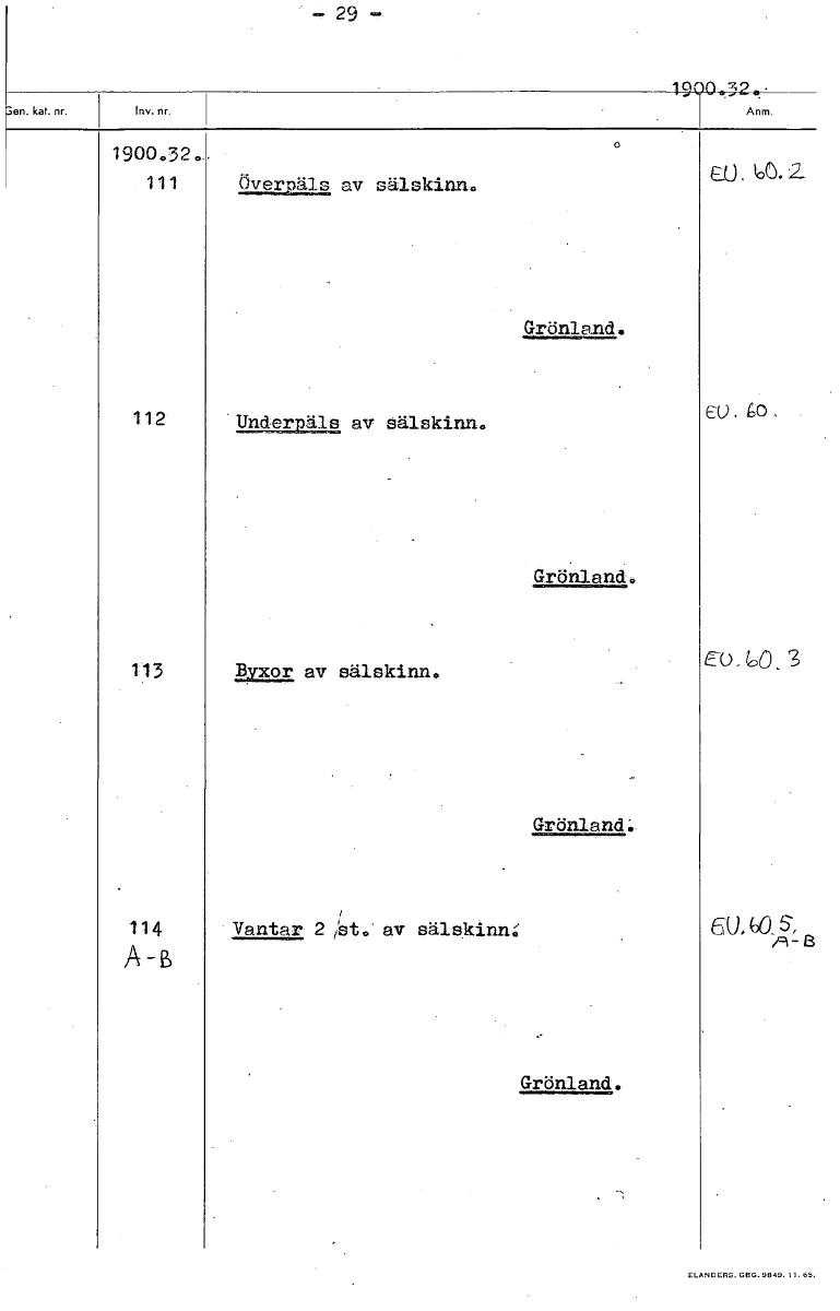 • 29— 1900..32.j 1900,32. 111 ÖvertAls av sälskinn. Grönland. 112 Und av sälskinn. EU . £,0 Grönland. E0 113 Byxor av sälskinn. _ 60 GrönlancL. 114 Vantar 2 . av sälskinn EU, GO_ A -B Grönland. [ocr]