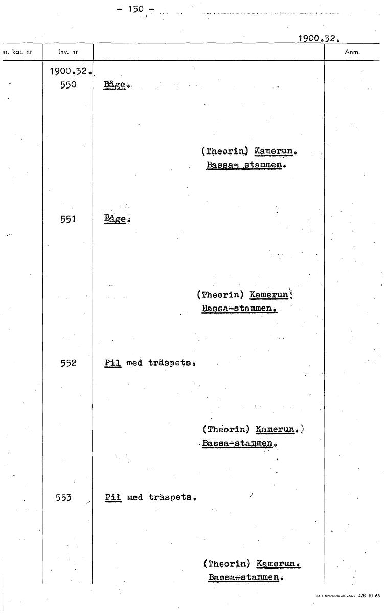 • - 15.0 1900.32:0 1900452" 550 Båge (Theorin) Kamerun. Basse- stammen. 551 Båge. (Theorin) Kamerunl Bessastammeni, 552 Pil med träspete. (Theorin) Kamerun') Bassa-stammen. 553 Pil med träspets. (Theori... Visa hela