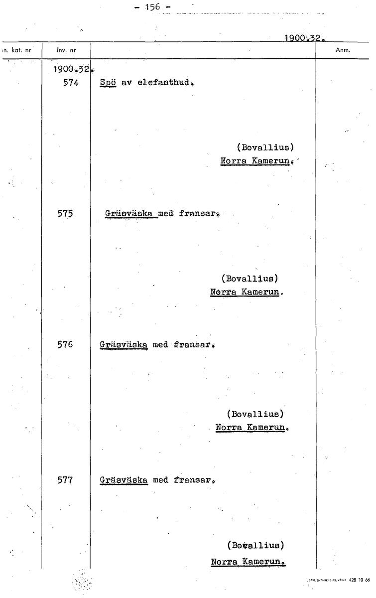 • 156 1900'032. 1900.32 574 Dö av elefanthud. (Bovallius) Norra Kamerun,' 575 Gräsväska med fransar. (Bovallius) Norra Kamerun. 576 Gräsväska med fransar. (Bovallius) Norra Kamerun. 577 Gräsväska med fr... Visa hela