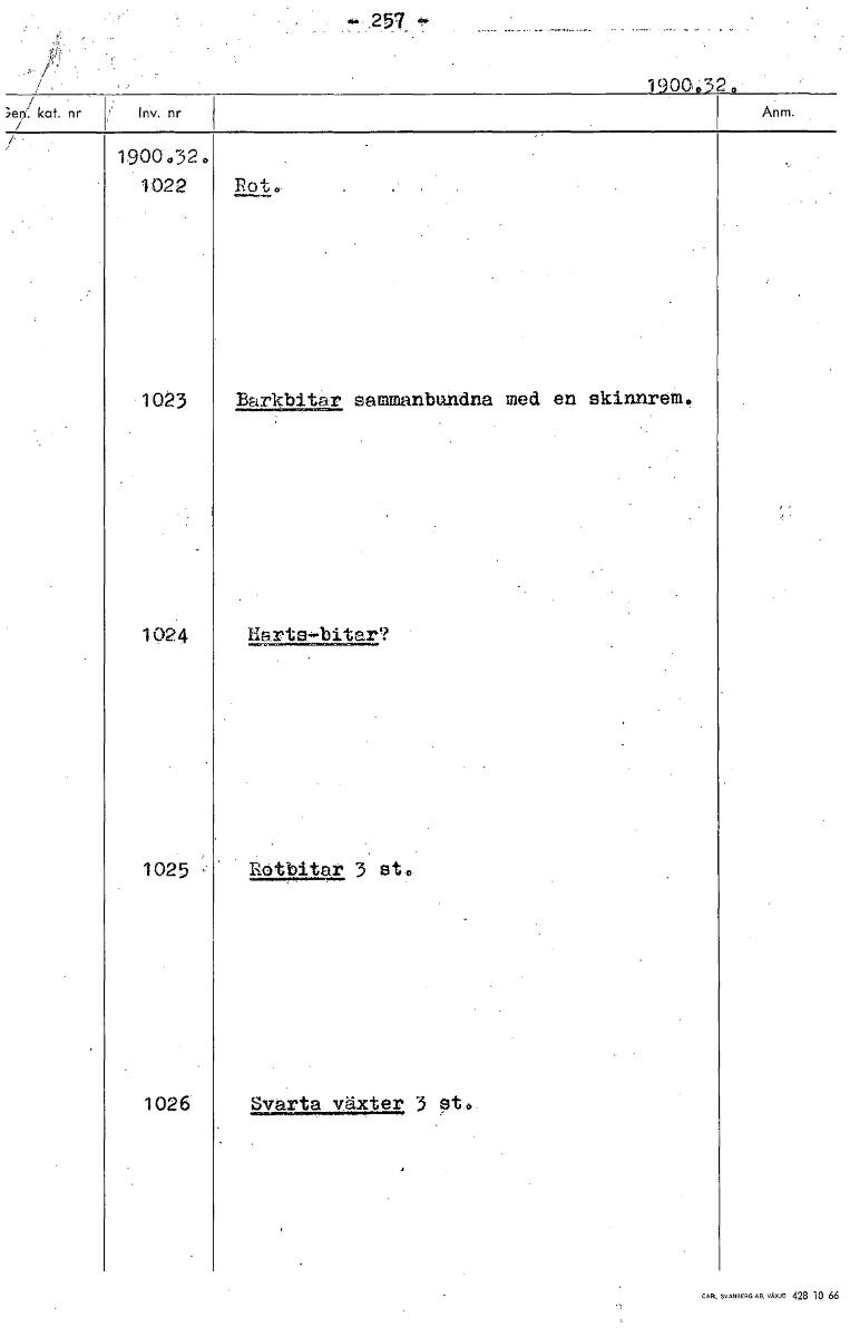 • 257 1900,;320 / 1900.320 1022 Rot. 1023 Barkbitar sammanbundna med en skinnremo 1924 Harts-bitar? 1025 Rotbitar 3 st, 1026 Svarta växter 3 st. [ocr]