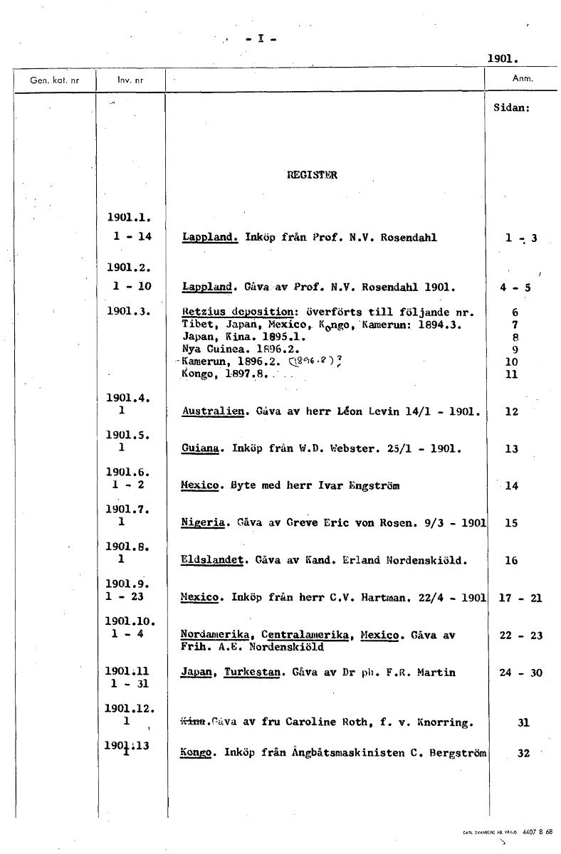1901. Sidan: REGISTER 1901.1. 1 - 14 Lappland. Inköp från Prof. N.V. Rosendahl 1 3 1901.2. 1 - 10 Lappland. Gåva av Prof. N.V. Rosendahl 1901. 4 - 5 1901.3. Retzius deposition: överförts till följande nr. 6 Tibet, Japan, Mexico, Kongo, Kamerun: 1894.3. 7 Japan, Kina. 1895.1. 8 Nya Guinea. 1896.2. 9 -Kamerun, 1896.2. 10 Kongo, 1997.8.. 11 1901.4. 1 Australien. Gåva av herr Lon Levin 14/1 - 1901. 12 1901.5. 1 Guiana. Inköp från W.D. Webster. 25/1 - 1901. 13 1901.6. 1 - 2 Mexico. Byte med herr Ivar Engström 14 1901.7. 1 Nigeria. Gåva av Greve Eric von Rosen. 9/3 - 1901 15 1901.8. 1 Eldslandet. Gåva av Kand. Erland Nordenskiöld. 16 1901.9. 1-23 Mexico. Inköp från herr C.V. Hartman. 22/4 - 1901 17 - 21 1901.10. 1 - 4 Nordamerika, Centralamerika, Mexico. Gåva av 22 - 23 Frih. A.E. Nordenskiöld 1901.11 Japan, Turkestan. Gåva av Dr pli. F.R. Martin 24 - 30 1 - 31 1901.12. 1 i.-inft.rdva av fru Caroline Roth, f. v. Knorring. 31 1901113 Kongo. Inköp från Ängbåtsmaskinisten C. Bergström 32 [ocr]