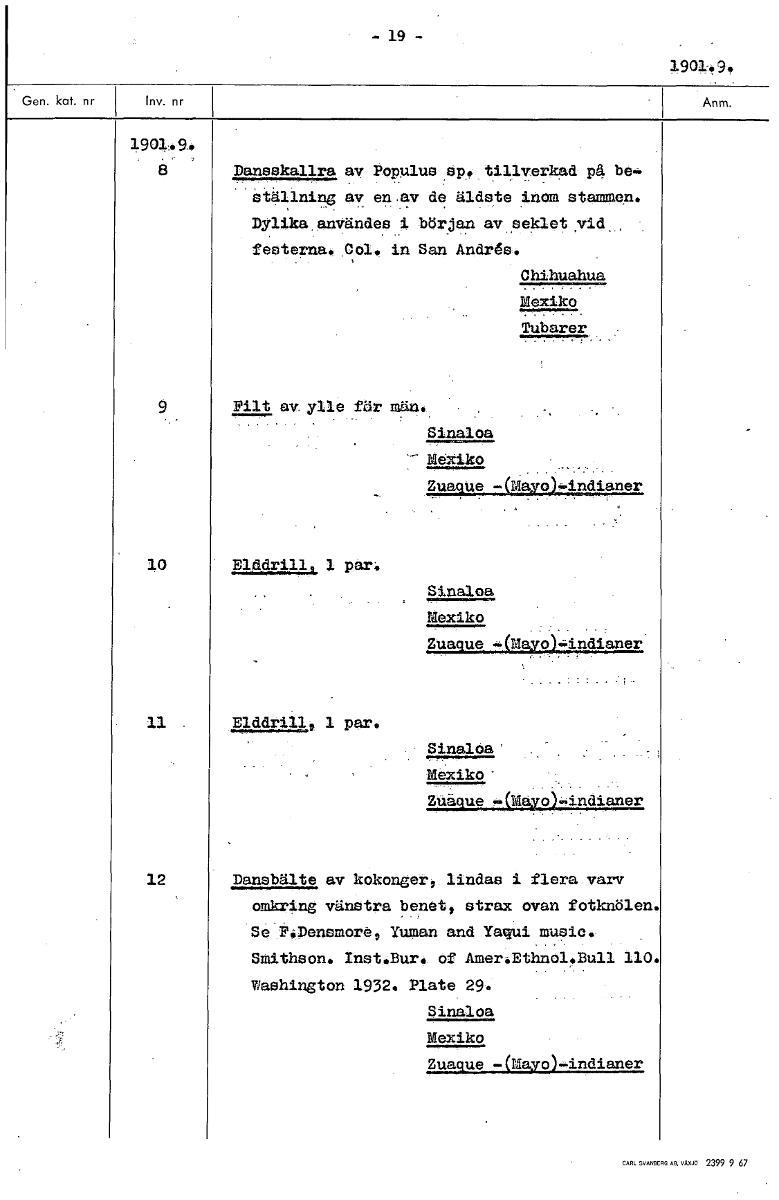 - 19 - J,9054-49, 191. Dansskallra av Popplus sp. tillverkad p4 Ställning av en.av de äldste inom stammen. Dylika användes i början av seklet ,vid,_ festerna.,0ea, in San Andligs. Chihuahua Mexiko Tubarer .......,.. 9 Pilt av. ylle för män. Sinaloa Mexiko Zuaque -(Mayo)..indianer 10 Elddrill. 1 par: Sinaloa Mexiko Zuaque -(MaY0)-7.indianer Elddrill, 1 par. Sinaloa Mexiko - Zuaque -(Mayo) -indianer 12 Dansbälte av kokongery lindas i flera varv omkring vänstra benet, strax ovan fotknölen. Se PäDensmore, Yuman and Yaqui music. Smitheon. Inst.Bur. of Amer.Ethnol.Bull 110. Washington 1932. ?late 29. Sinaloa Mexiko Zuaque -(Mayo)-indianer [ocr]