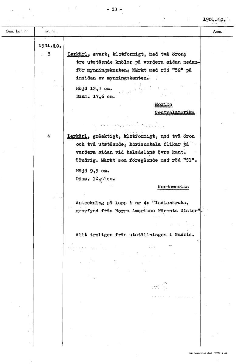 • - 23 - 1901, 19014.04 3 Lerkärl, svart, klotformigt, med två öron; tre utstående knölar på vardera sidan nedan- för mynningskanten. Märkt med röd "52" på insidan av mynningskanten. Höjd 12,7 cm. Diam.... Visa hela