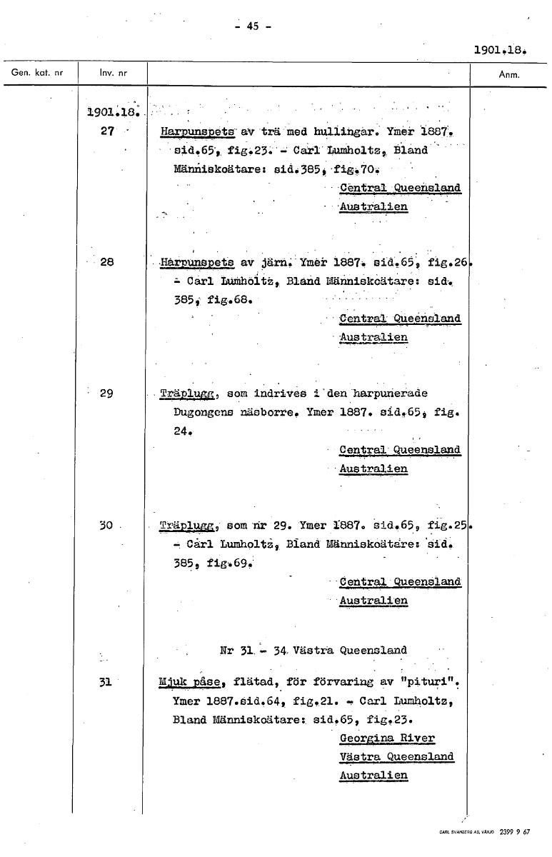 - 45 - 1901.18. 1901:18;- 27 Harpunsnets-aV trä'med hullingore Ymet 1887'. fig,23,; CatI Lumholtz Bland Människoätare: sid.385 -Central-Queensland --Australien 28 •axpunspets av järn. Ymet 1887. sid.6...