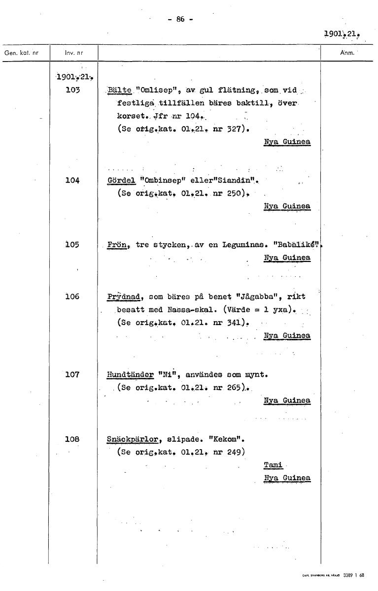 - 86 - 1901;21. 19Ö1 '21:. 103 Bälte "Omlisep", av gul flätning..som vid festligai tillfällen bäres baktill, över korset,. Jfr nr 104... (Se otig.kat. 01.21. nr 327). Nya Guinea 104 Gördel "Ombinsep" eller"Siandin". (Se orig.kat. 01.21.. nr 250). Nya . Guinea 105 . Frön tre styoken,.av en Ieguminas. "Babäiikdt Nya Guinea 106 Prydnad, som bäres på benet "Jågabba". rikt ,besatt med Nassa-skal. (Värde = 1 yxa). (Se orig.kat. 01.21. nr 341). Nya Guinea 107 Hundtänder "Ni", användes som mynt. (Se origekat. 01.21. nr. 265).. Eza221..._nea 108 Snäckpärlor, slipade. "Kekom". (Se orig.kat. 01.21. nr 249) Tami Nya Guinea [ocr]