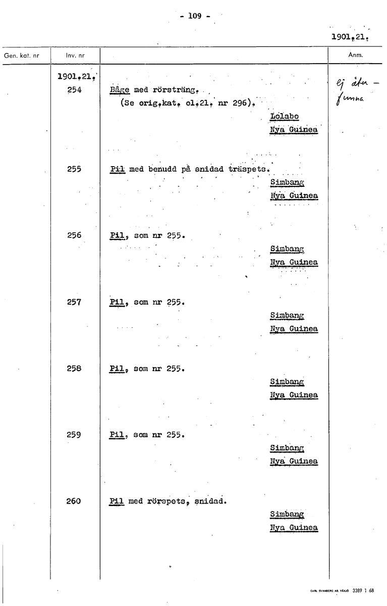 • - 109 - 190421. 1901.21 el 6114A 254 1314 med rörsträng. . (Se orig.kat. o121. nr 296). 0641 0 1 h G . Lälabo NYa ' Guinea 255 Pil med benudd på anidad träspets. 9122n_ a PAL49121a 256 Pil. som nr 255... Visa hela